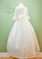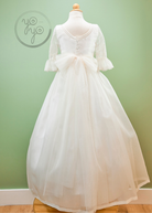 Delicate French sleeves feature an intricate embroidered lace design, adding refinement to its relaxed silhouette. The back ties into a flowing draped bow made from airy French tulle, creating an ethereal and graceful look. The skirt is simple yet elevated with a lace hem for a soft, romantic finish.