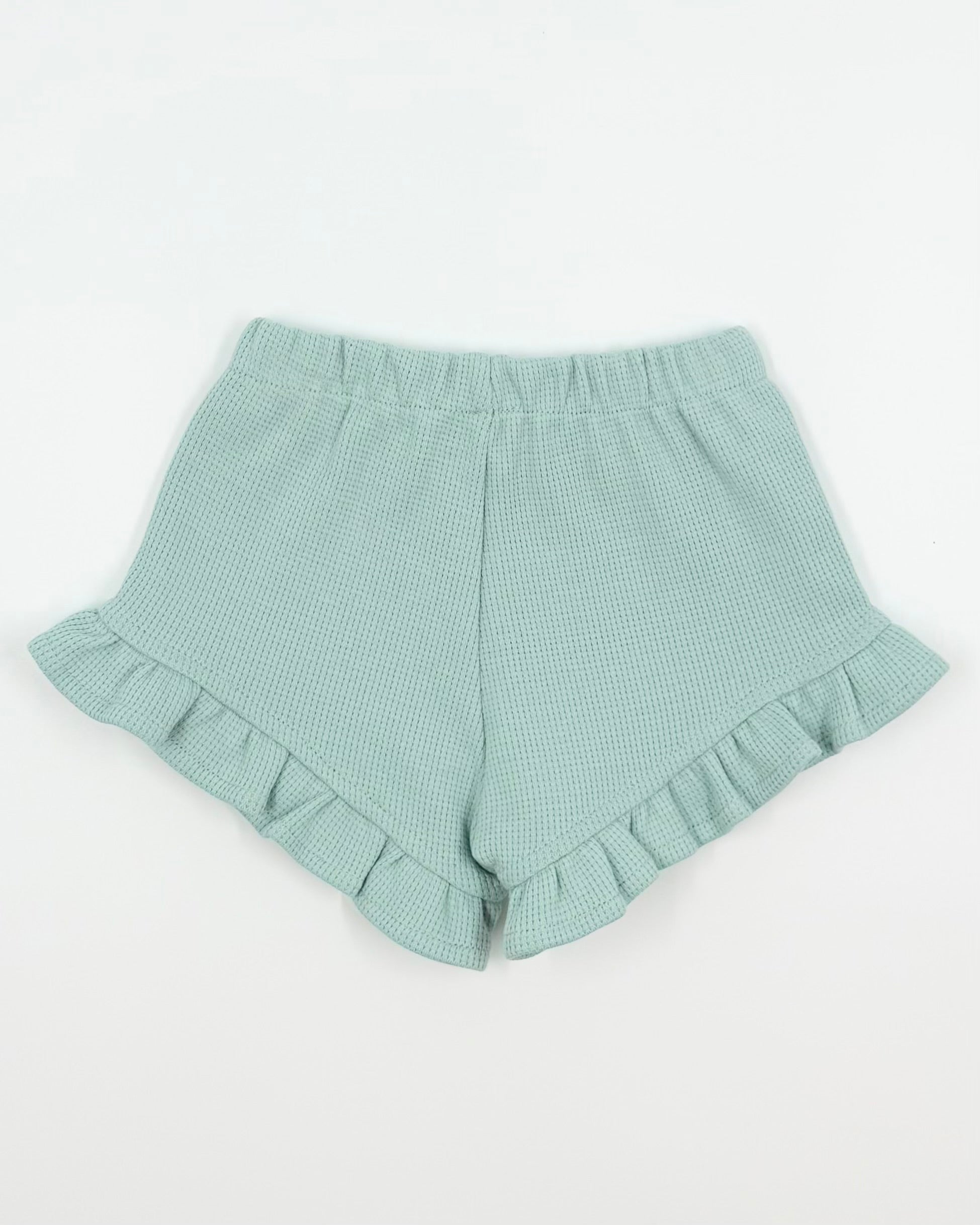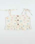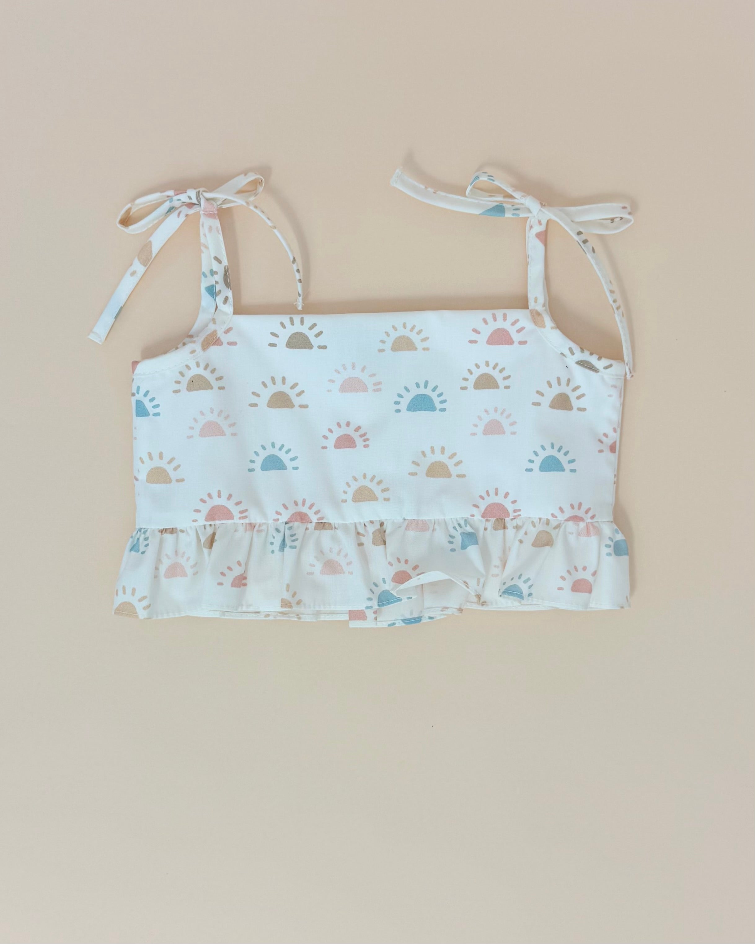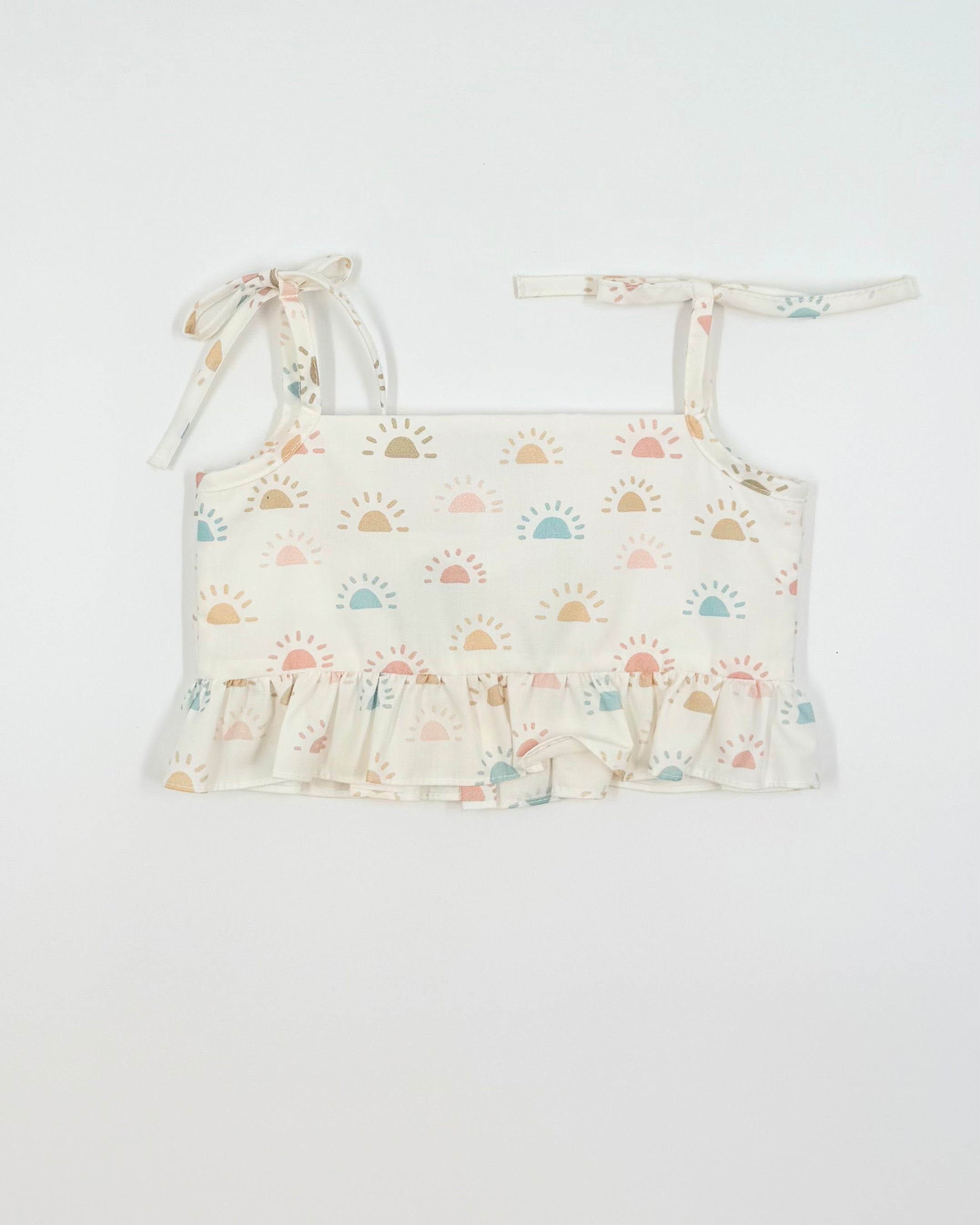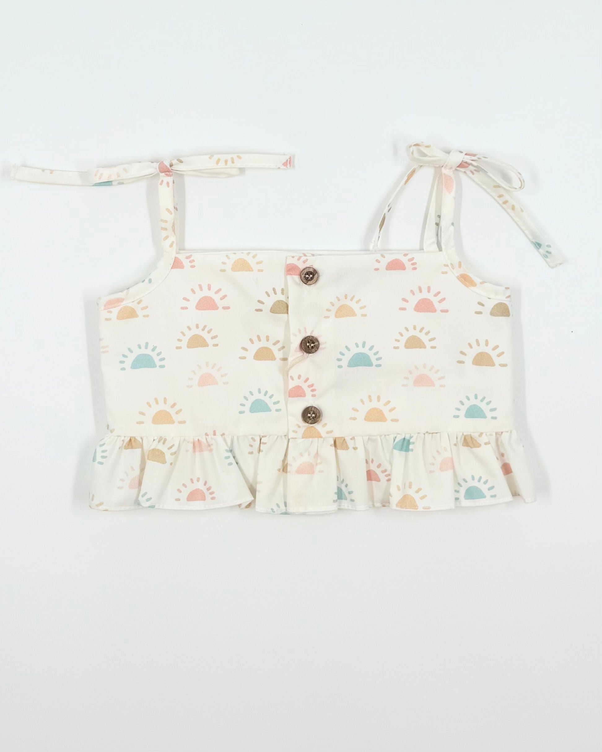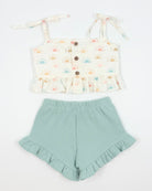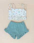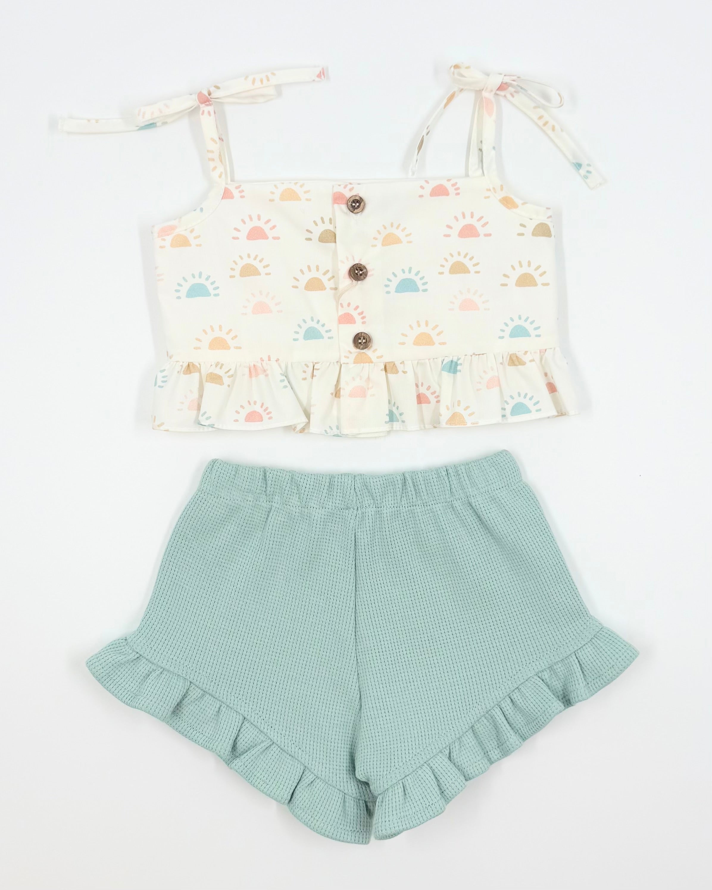 This adorable two-piece set for baby girls is perfect for sunny days. It features a lightweight shirt with delicate spaghetti straps and a cheerful sun pattern, paired with soft sage green shorts for a fresh, breezy look. Made in Spain with care and quality, it’s an ideal outfit to keep your little one cool and stylish all summer long.