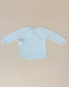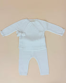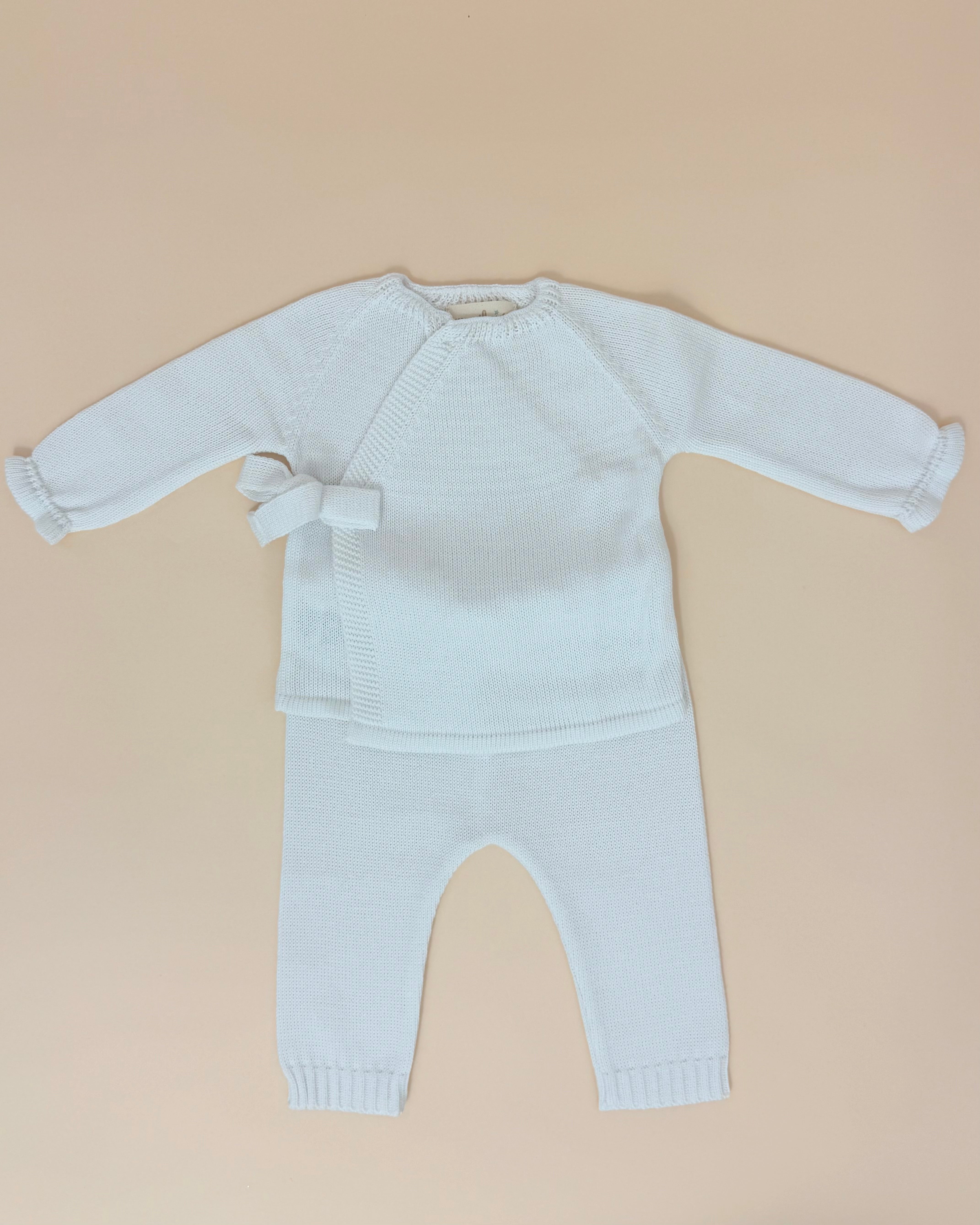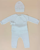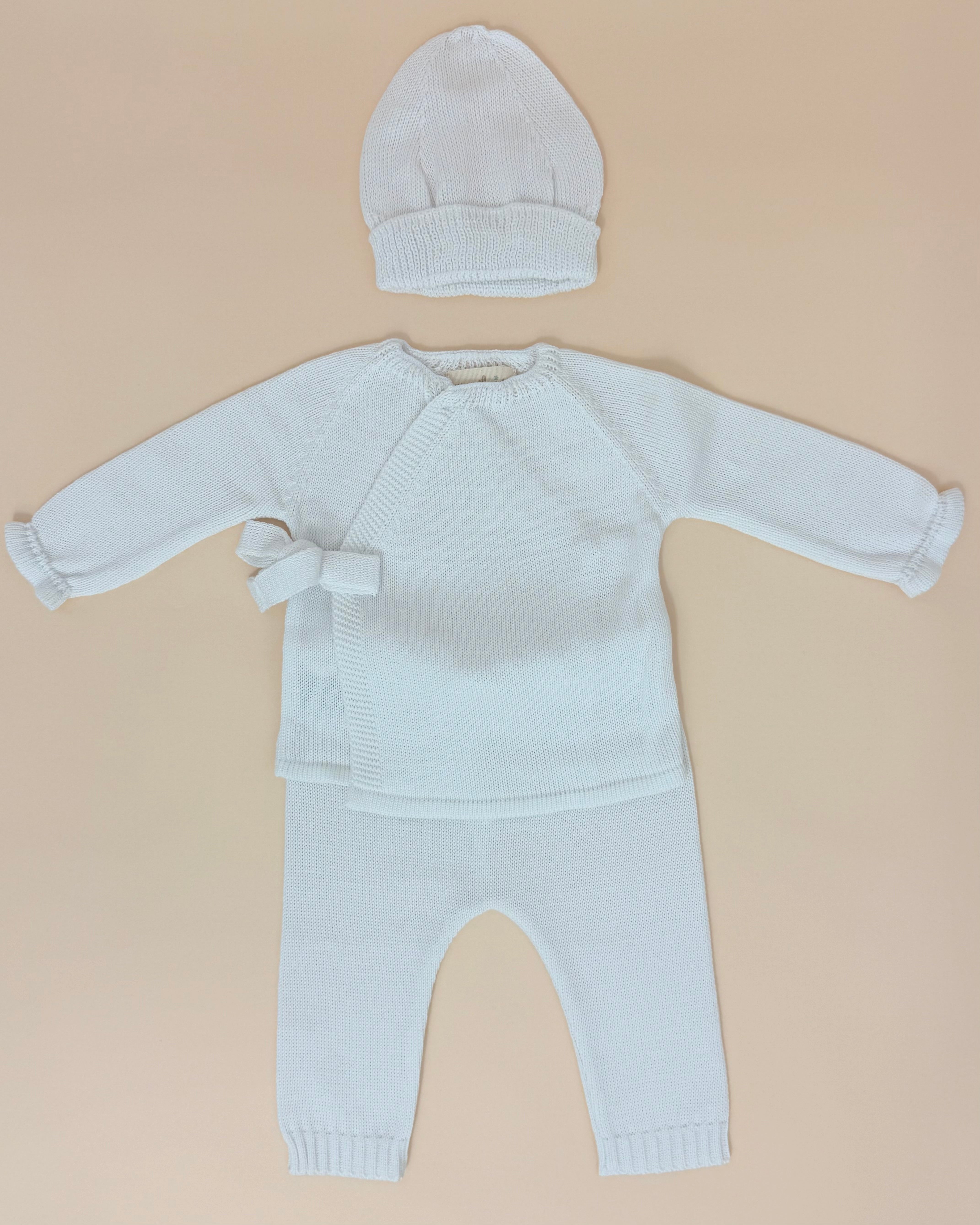 Elegant in its simplicity, this three-piece set in a white tone is a beautifully gender-neutral option for newborns. Thoughtfully designed for comfort and ease, the set includes a kimono-style top that ties gently at the front with a delicate knot—ideal for dressing your baby without the need to pull clothing over the head.