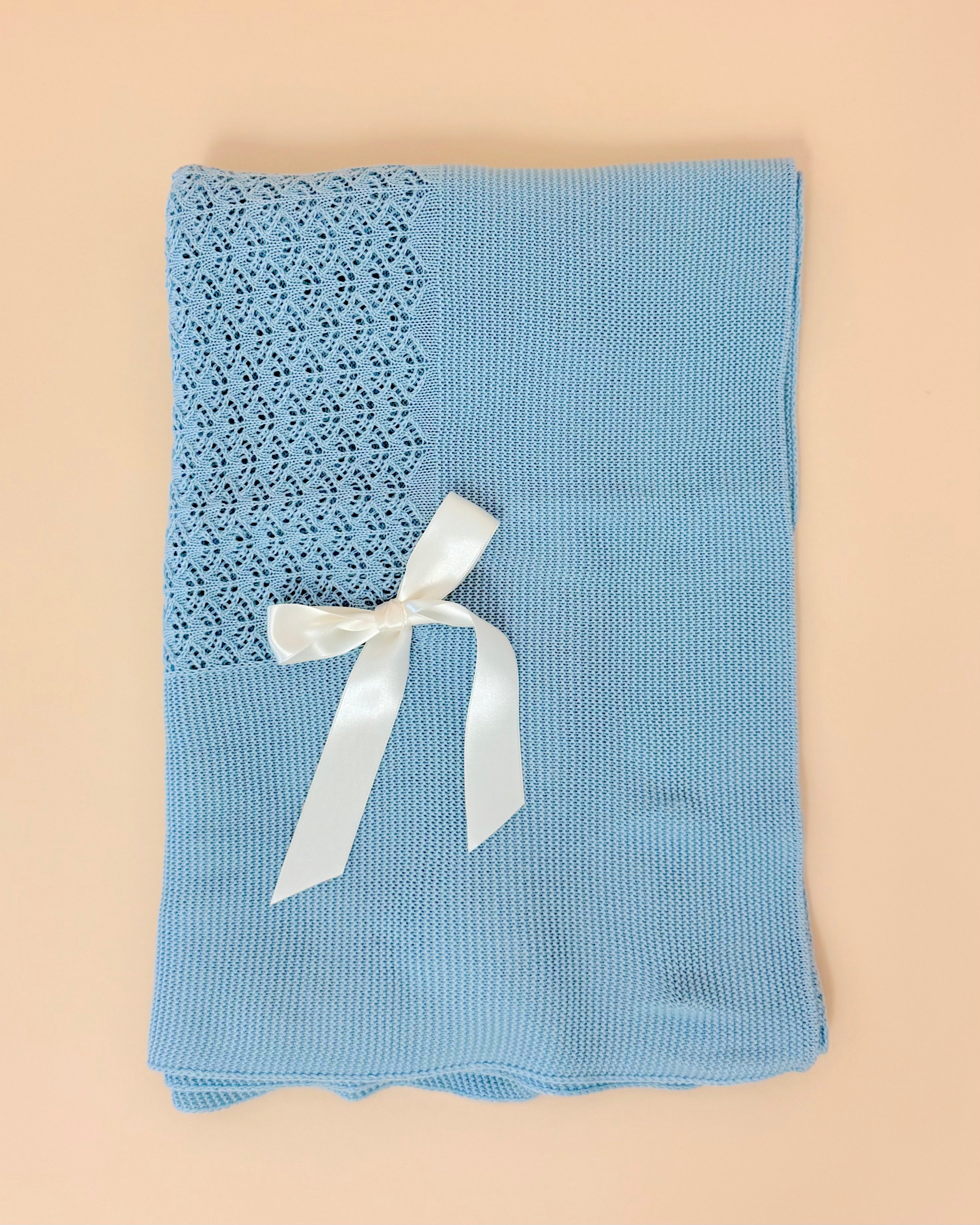 Classic and versatile, this blanket knitted blanket is a beautiful gender-neutral essential for any newborn. Handcrafted in Spain, it features a delicate white ribbon bow in one corner for a subtle, elegant touch.
