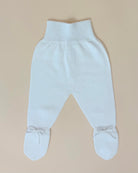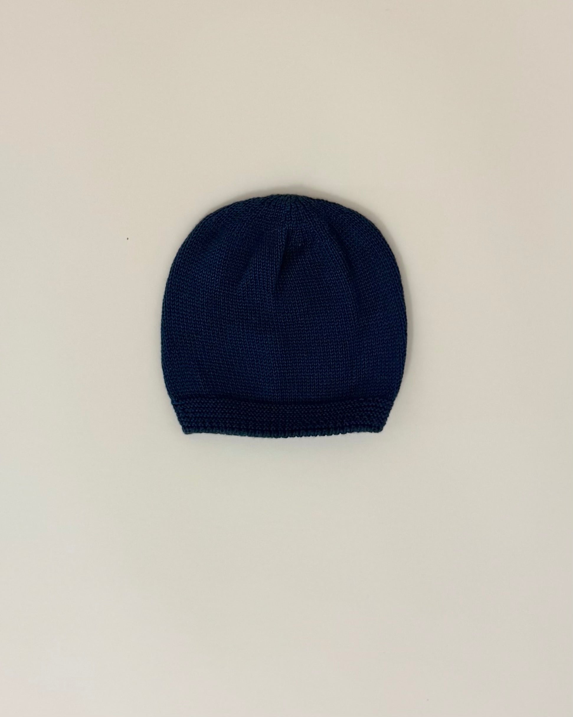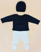 Handcrafted in Spain with exceptional quality and craftsmanship, the set includes a navy blue knitted top with back button closure, white footed pants, and a matching navy blue beanie—creating a clean and coordinated look ideal for those first special moments.