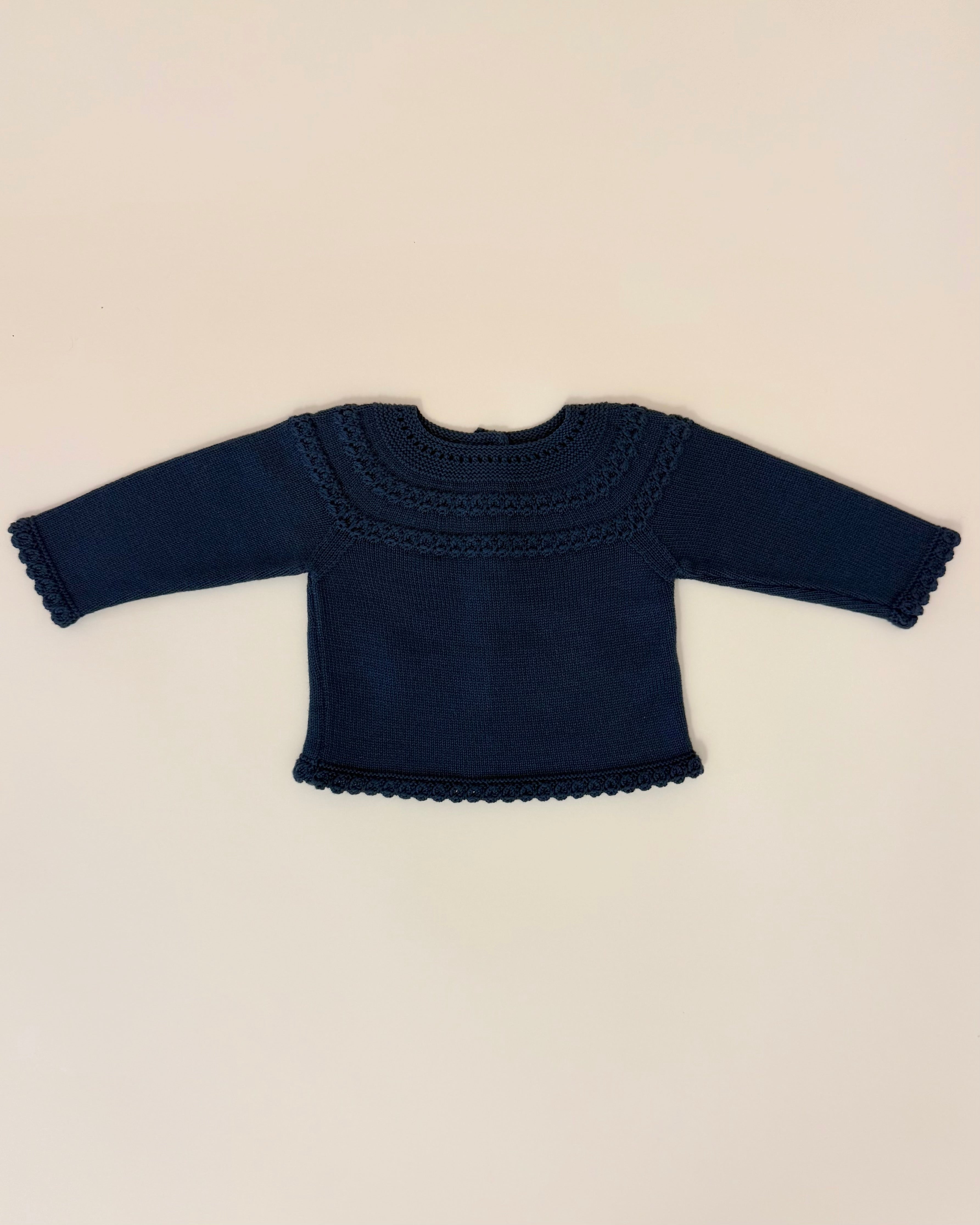 Classic and refined, this navy blue and white knitted outfit is a beautifully minimalist and traditional choice for welcoming your baby boy with timeless elegance.