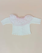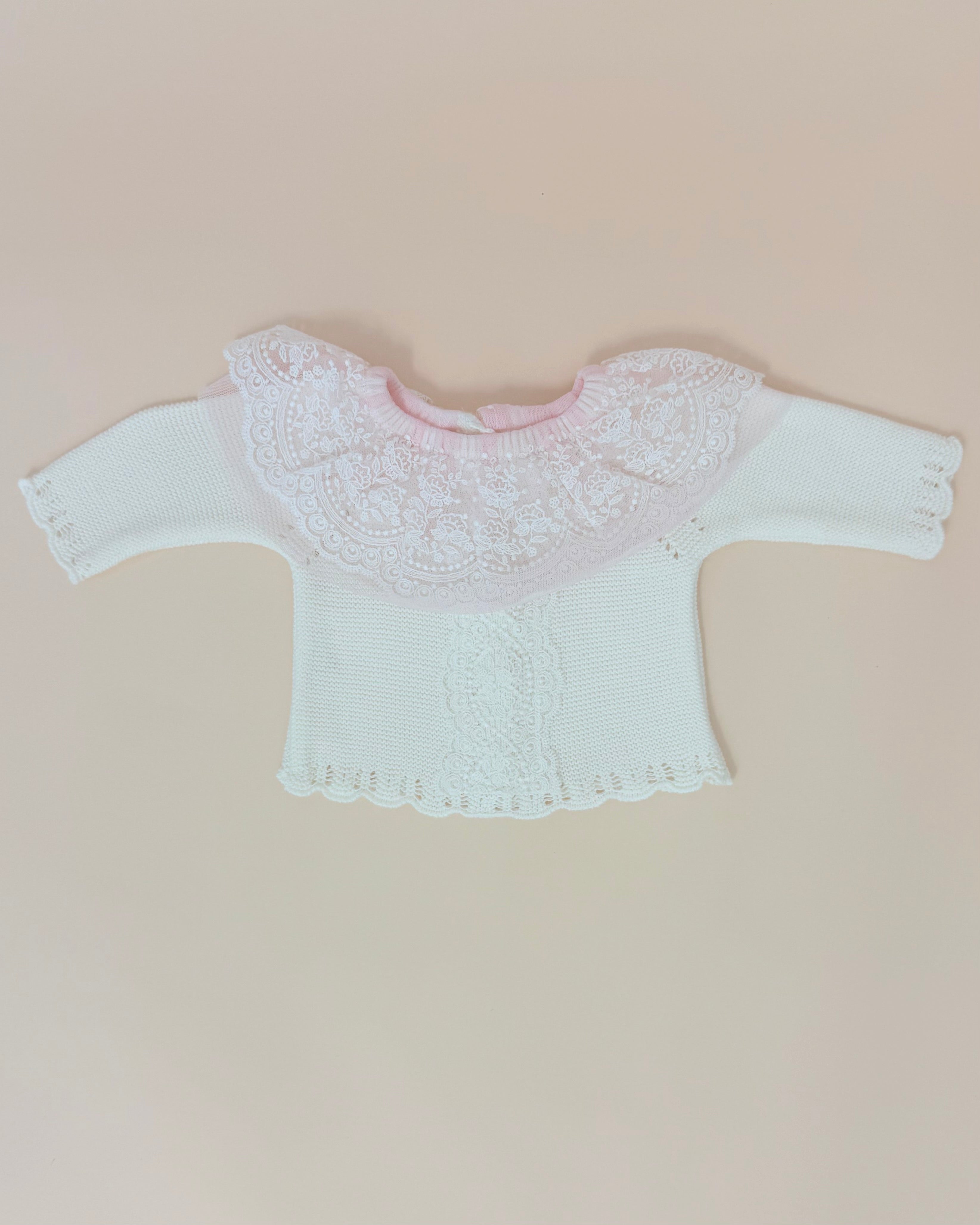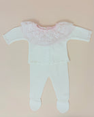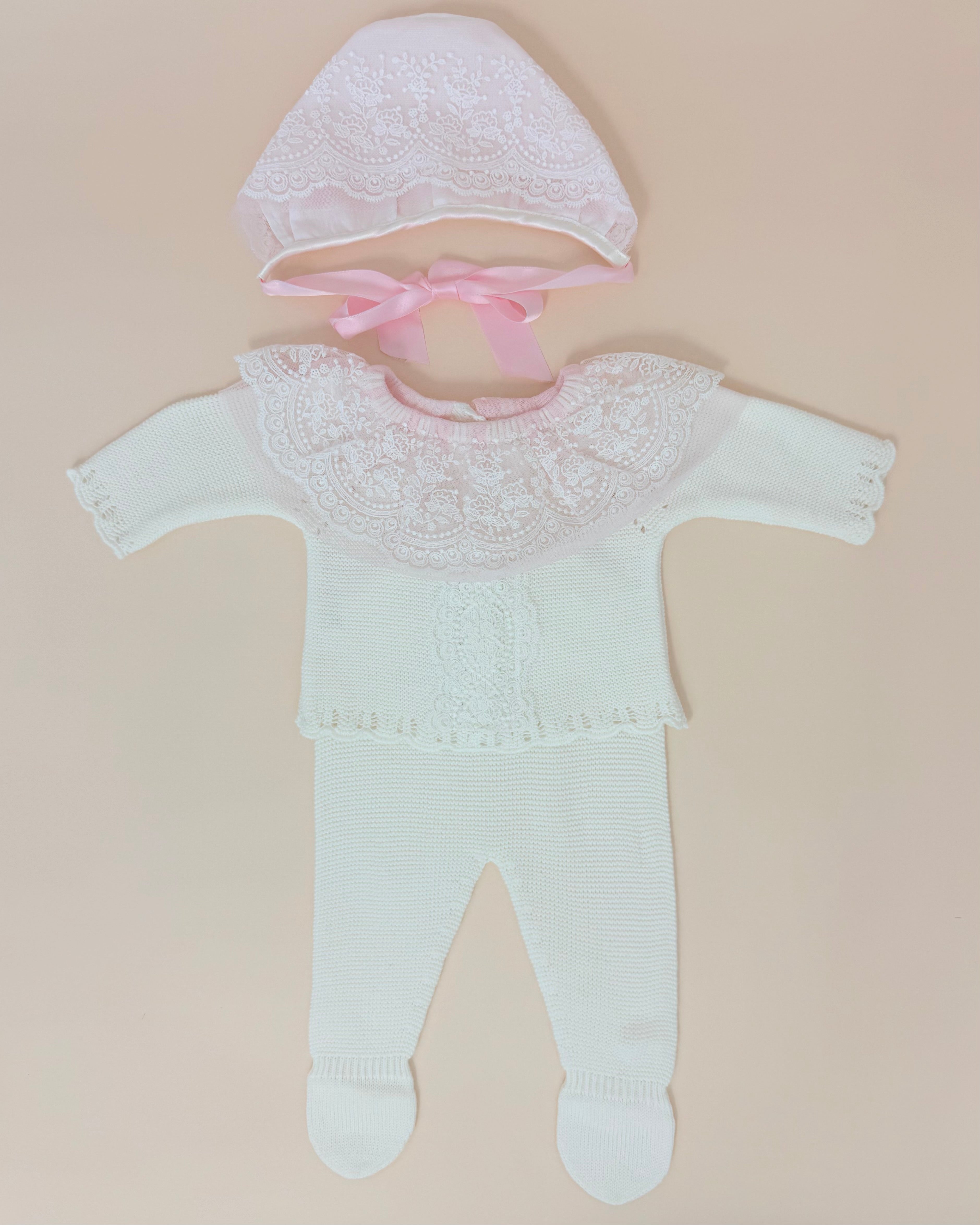Wrap your baby girl in elegance from her very first days with our exquisite three-piece newborn set, crafted in an off-white knit point. This heirloom ensemble includes a long-sleeve top adorned with delicate lace detailing along the collar—adding a timeless, regal touch that evokes classic European charm. The matching pants offer comfort and warmth, while the coordinating lace bonnet completes the look with grace and refinement.
