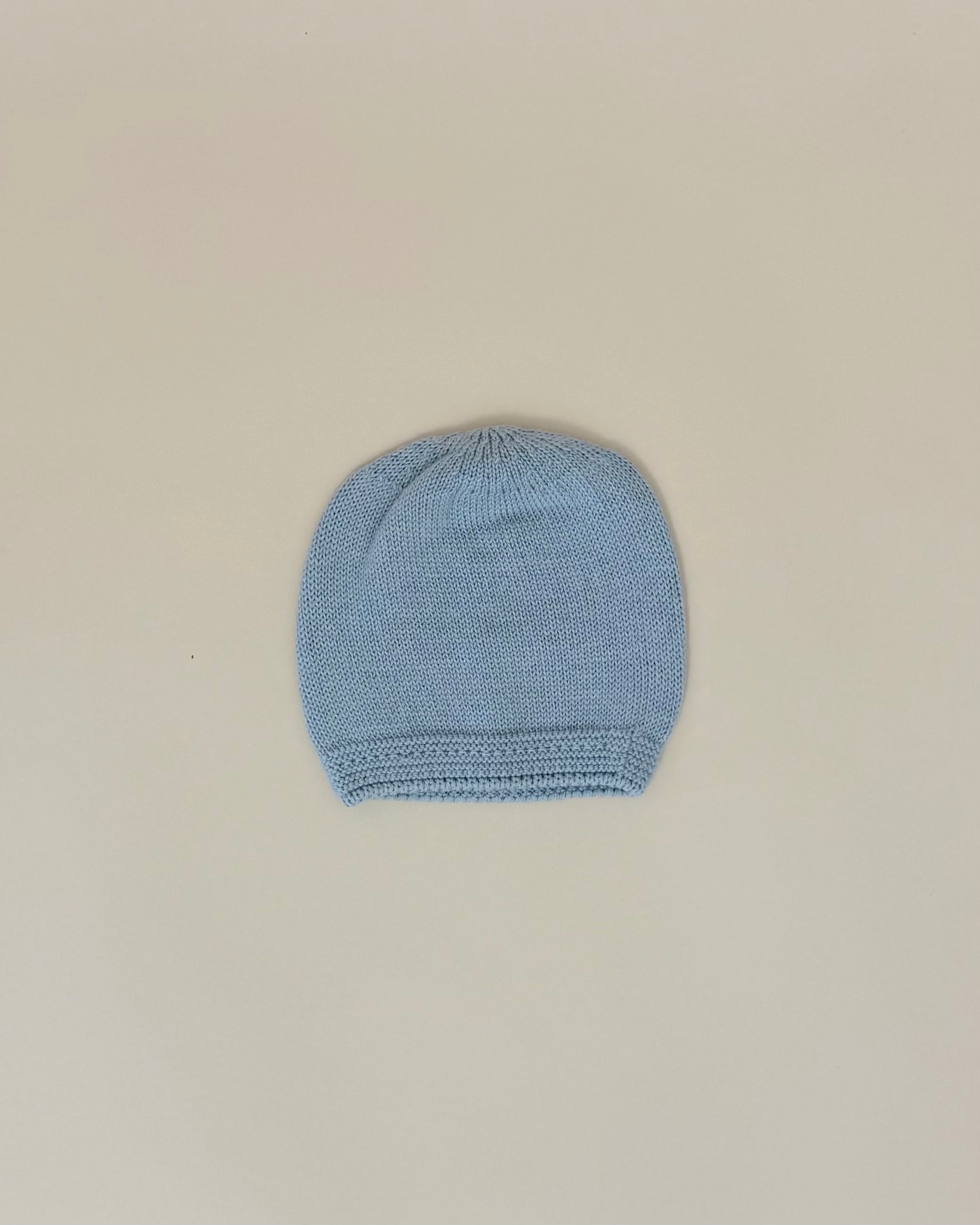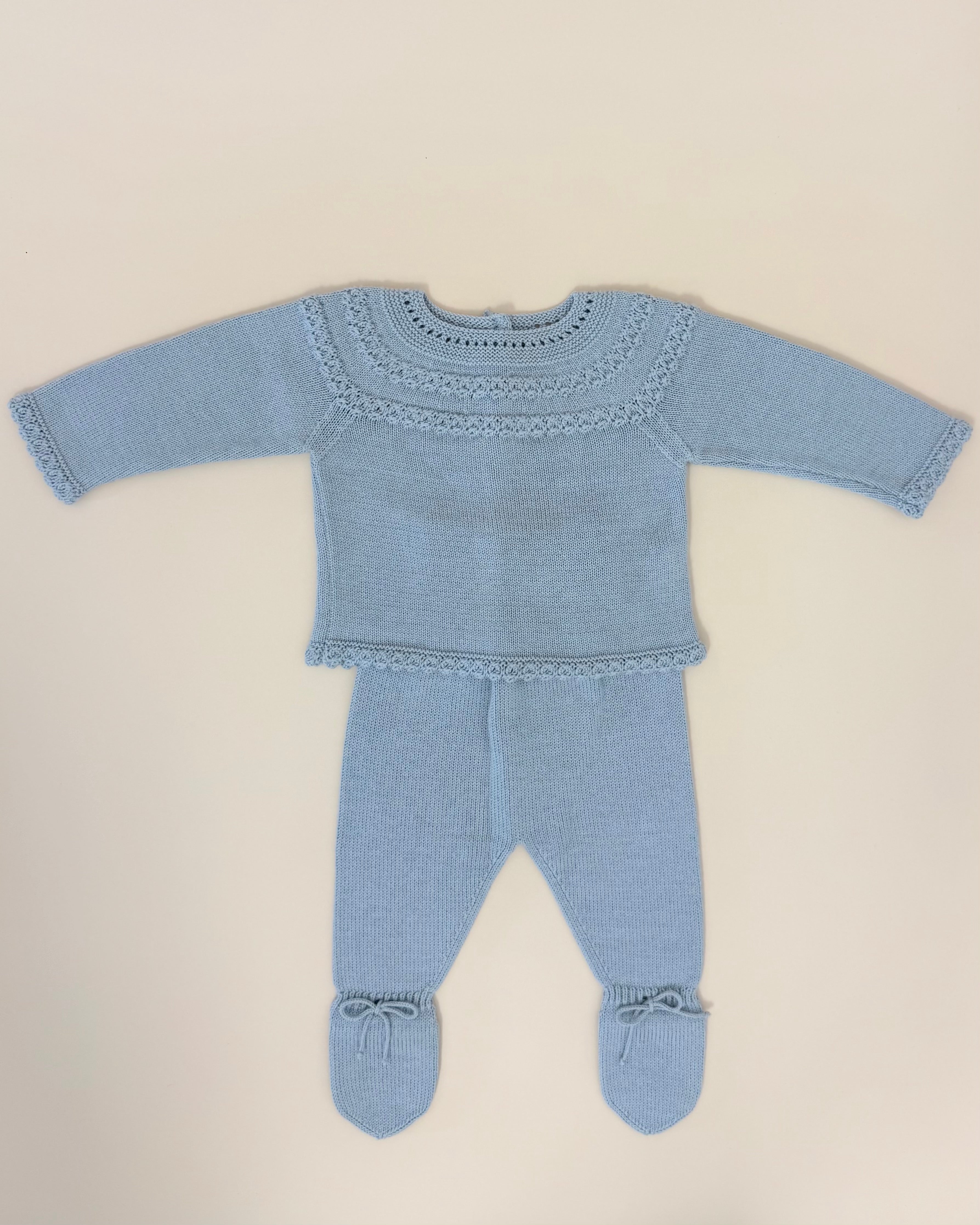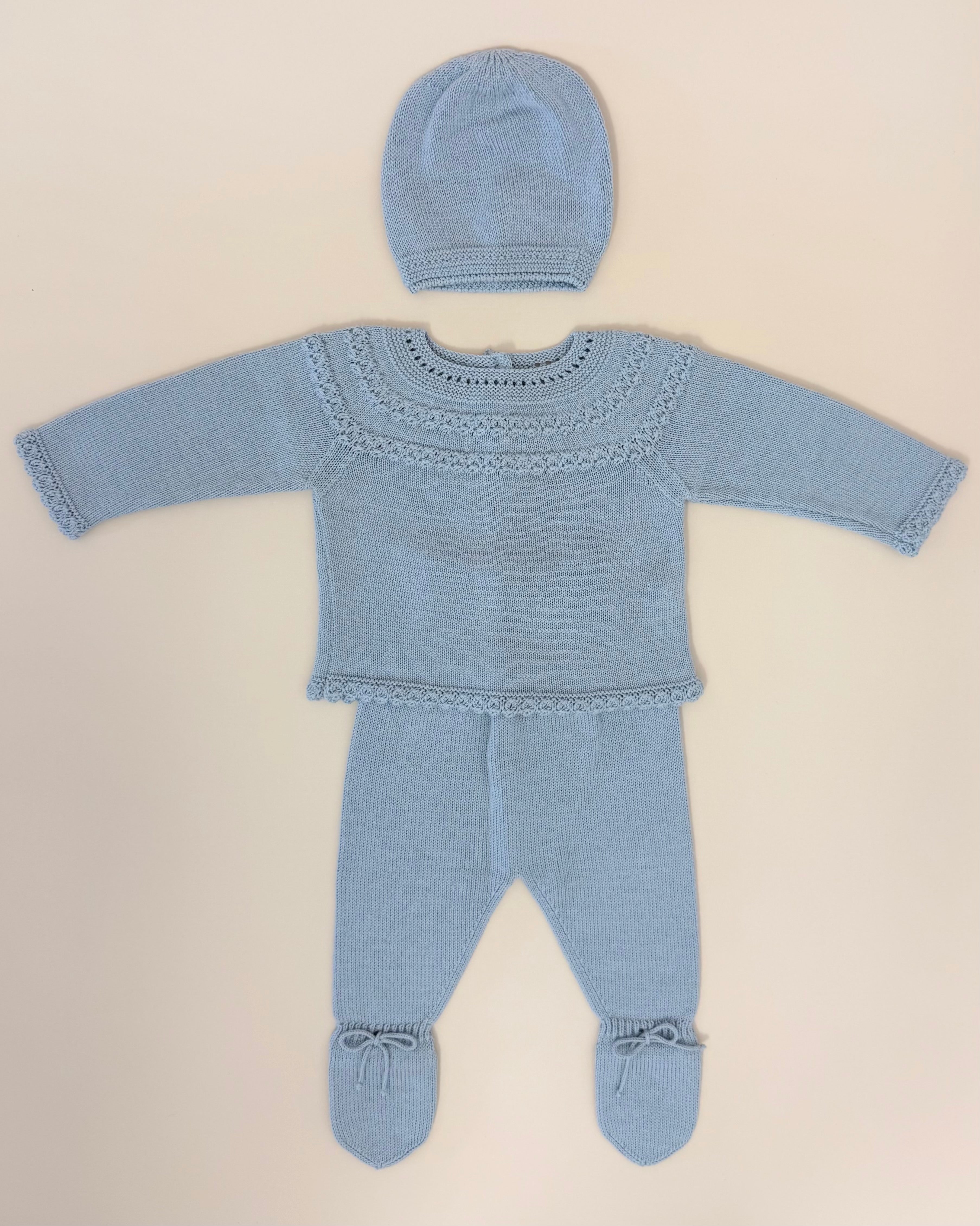 Handcrafted in Spain with exceptional quality and attention to detail, the set includes a knitted top with back button closure, matching footed pants, and a coordinated beanie—creating a refined and timeless look.