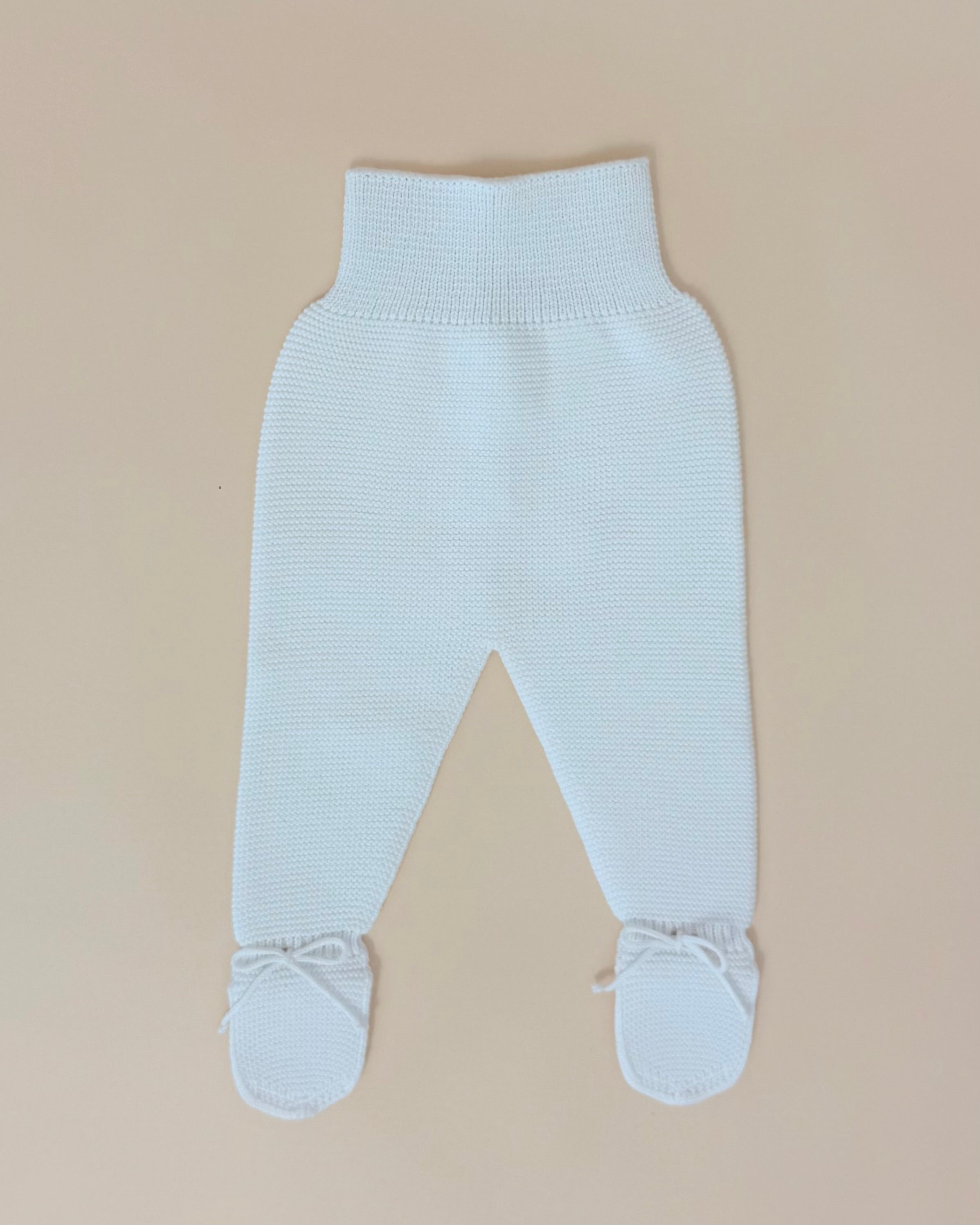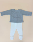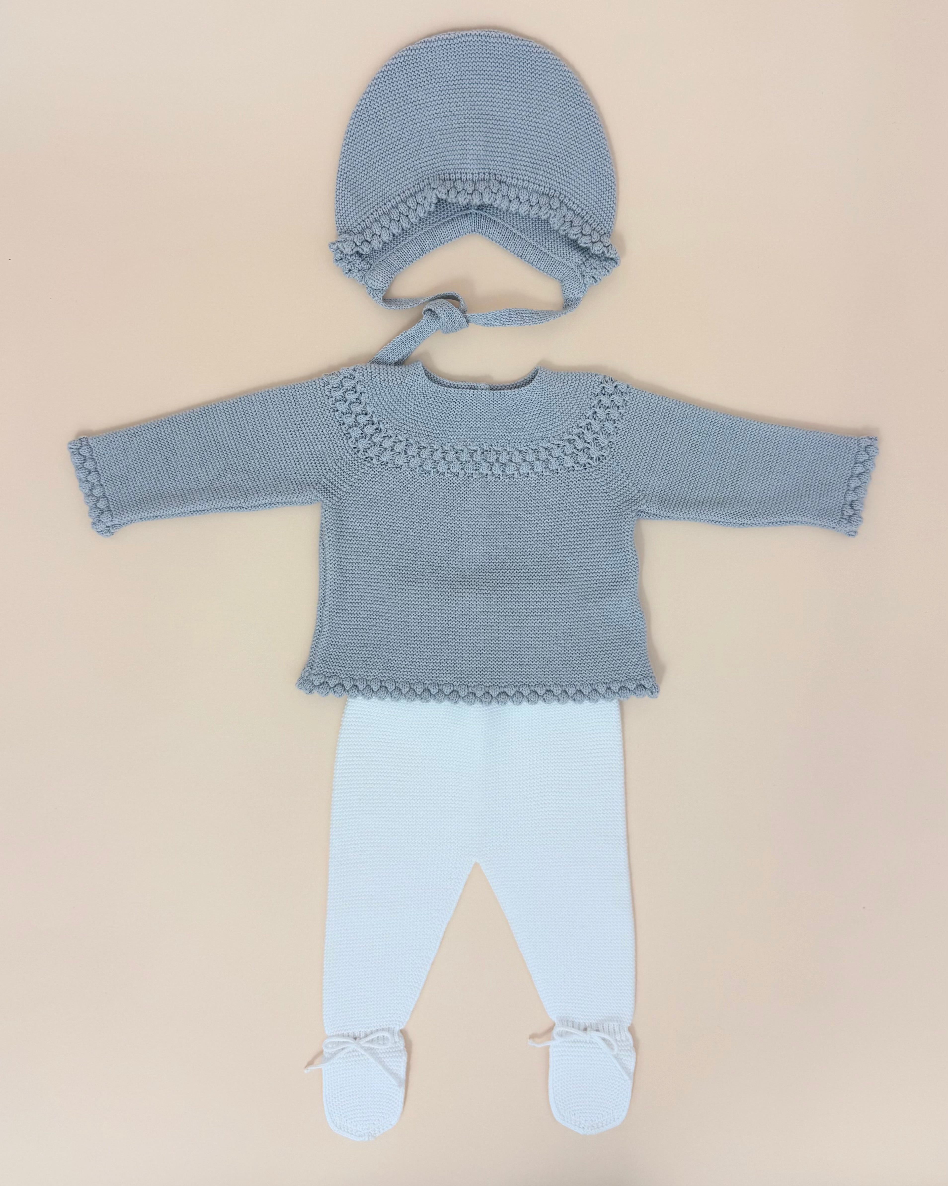 Handcrafted in Spain with a focus on quality and craftsmanship, this minimalist 3-piece set includes a grey knitted top with back button closure, white footed pants, and a matching grey bonnet for a clean, coordinated look.