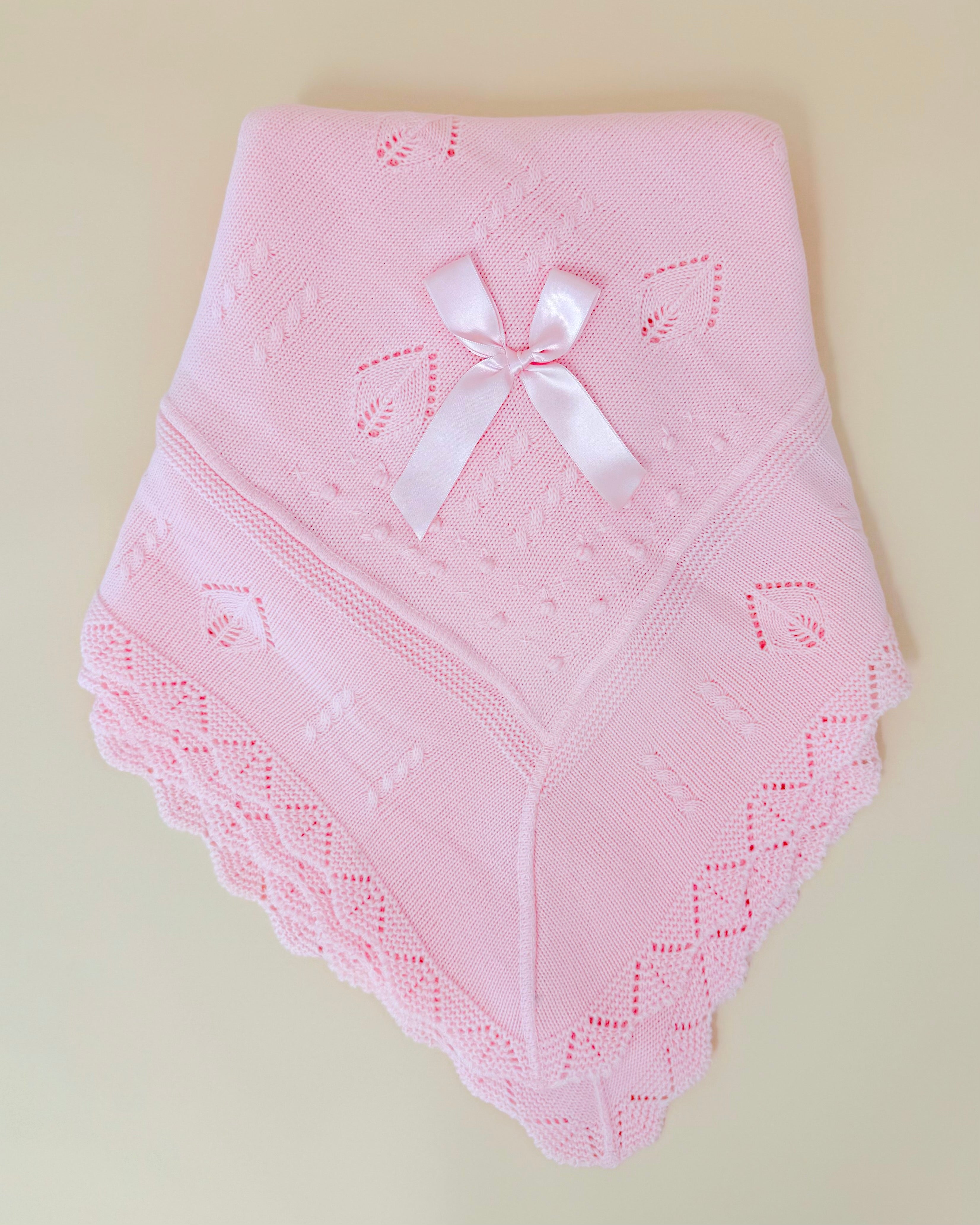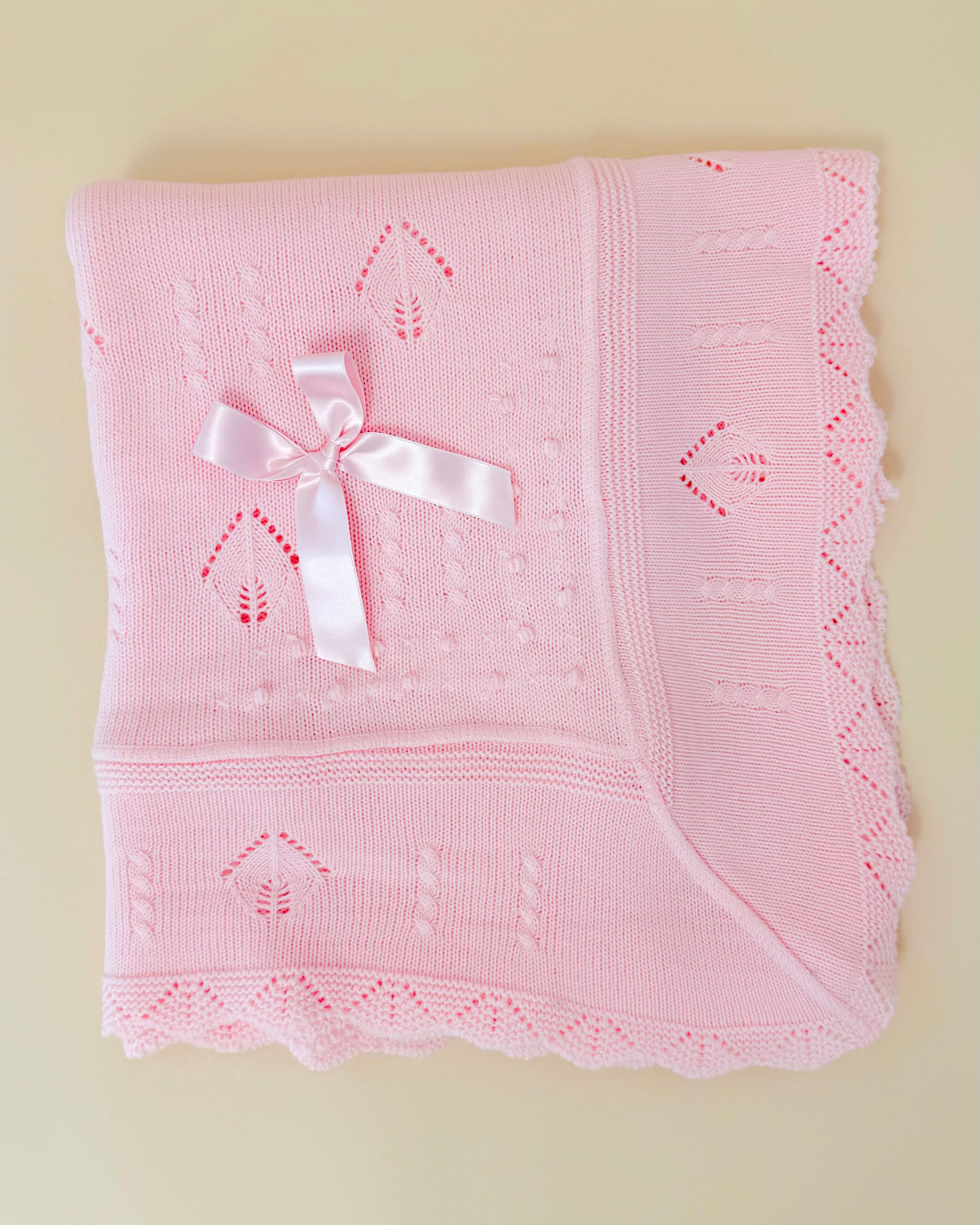 Soft, delicate, and full of charm, this pink knitted blanket is the perfect piece to welcome a newborn baby girl. Handcrafted in Portugal with love and care, it features a beautifully textured knit and a matching pink ribbon bow in one corner for a classic, feminine touch.