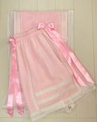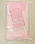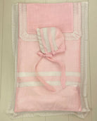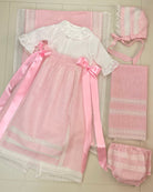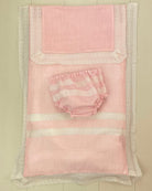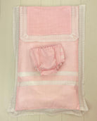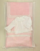 A delicate and unique six-piece set for a newborn baby, made with lightweight linen fabric, purple knit, and laces. It includes bloomers, bonnet, blanket, blouse, skirt, and quilted bed.