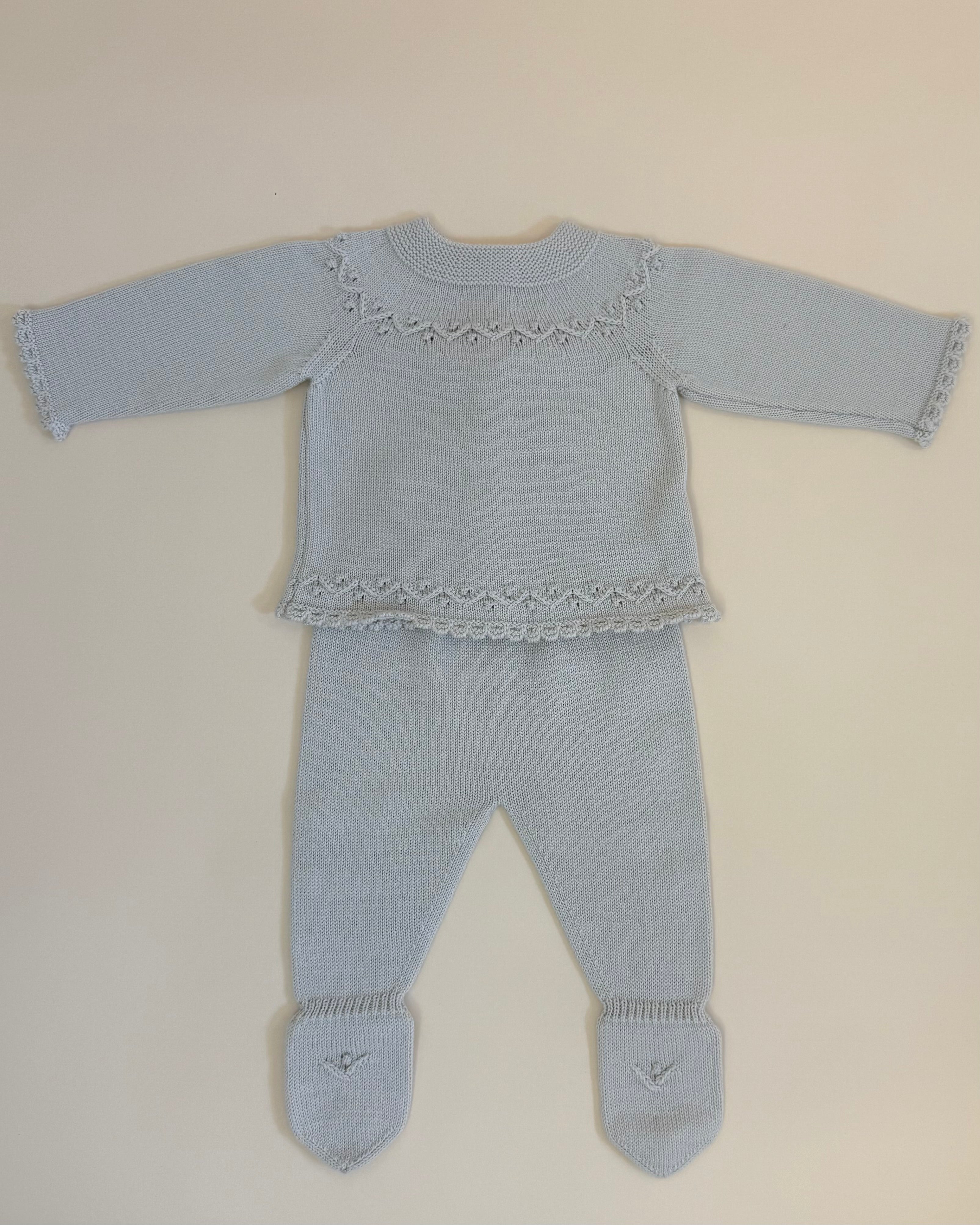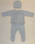 Handcrafted in Spain with exceptional quality and care, this set includes a knitted top with back button closure, matching pants, and a soft beanie for a complete and cozy look.