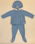Handcrafted in Spain with exceptional attention to quality, the set includes a knitted top with back button closure, matching footed pants, and a coordinated bonnet for a classic, cohesive look.