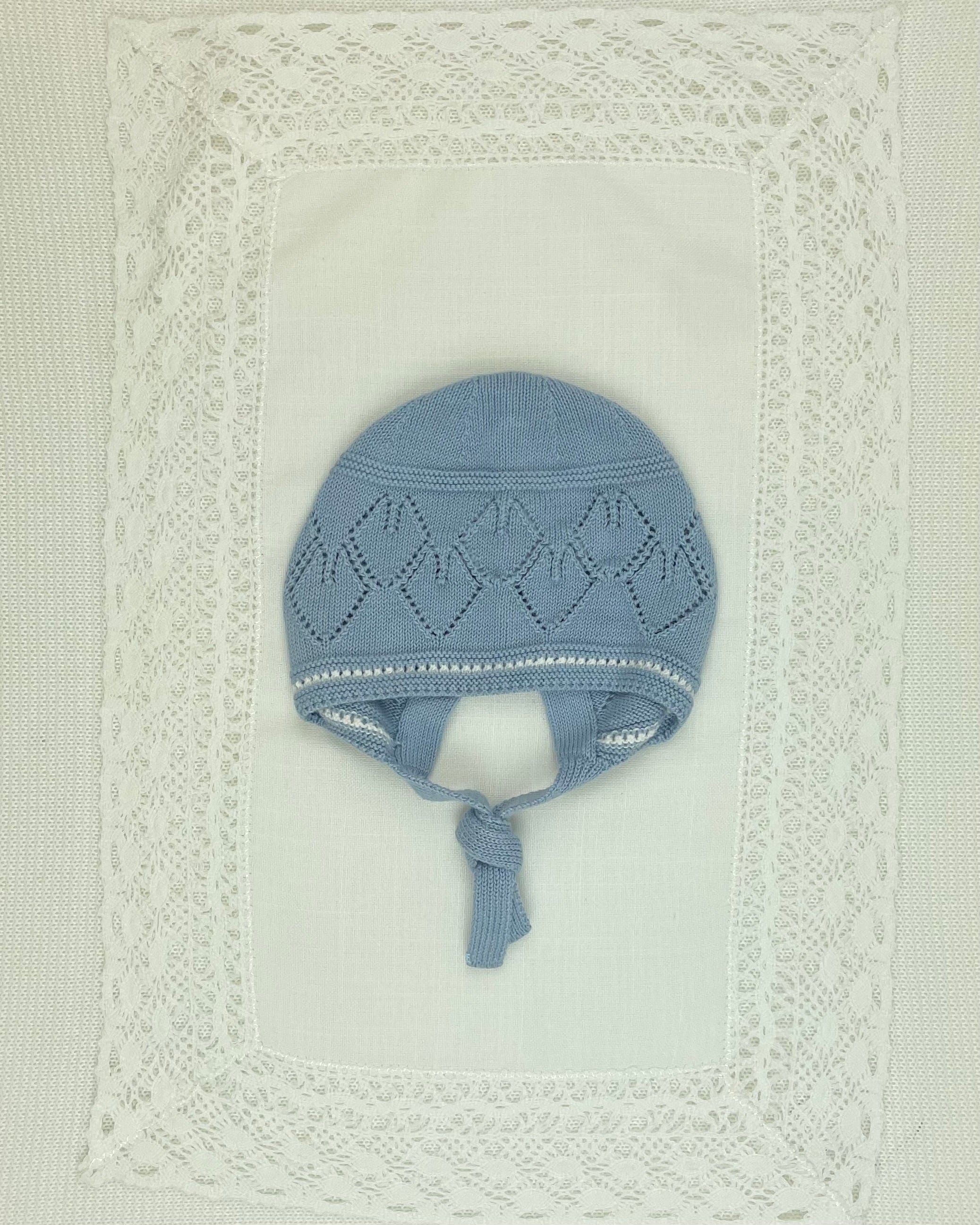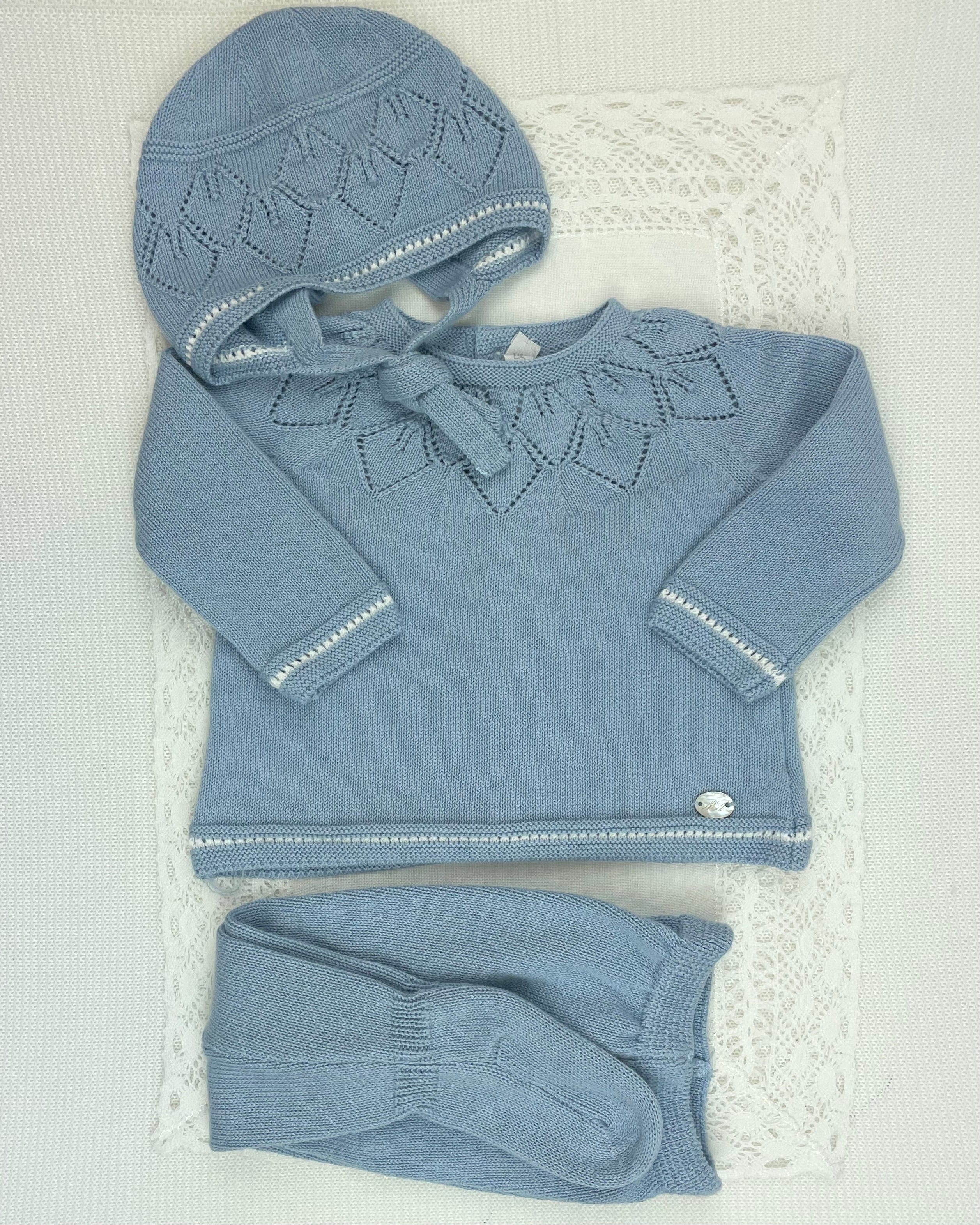 Handcrafted in Spain with exceptional attention to quality, the set includes a knitted top with back button closure, matching footed pants, and a coordinated bonnet for a classic, cohesive look.
