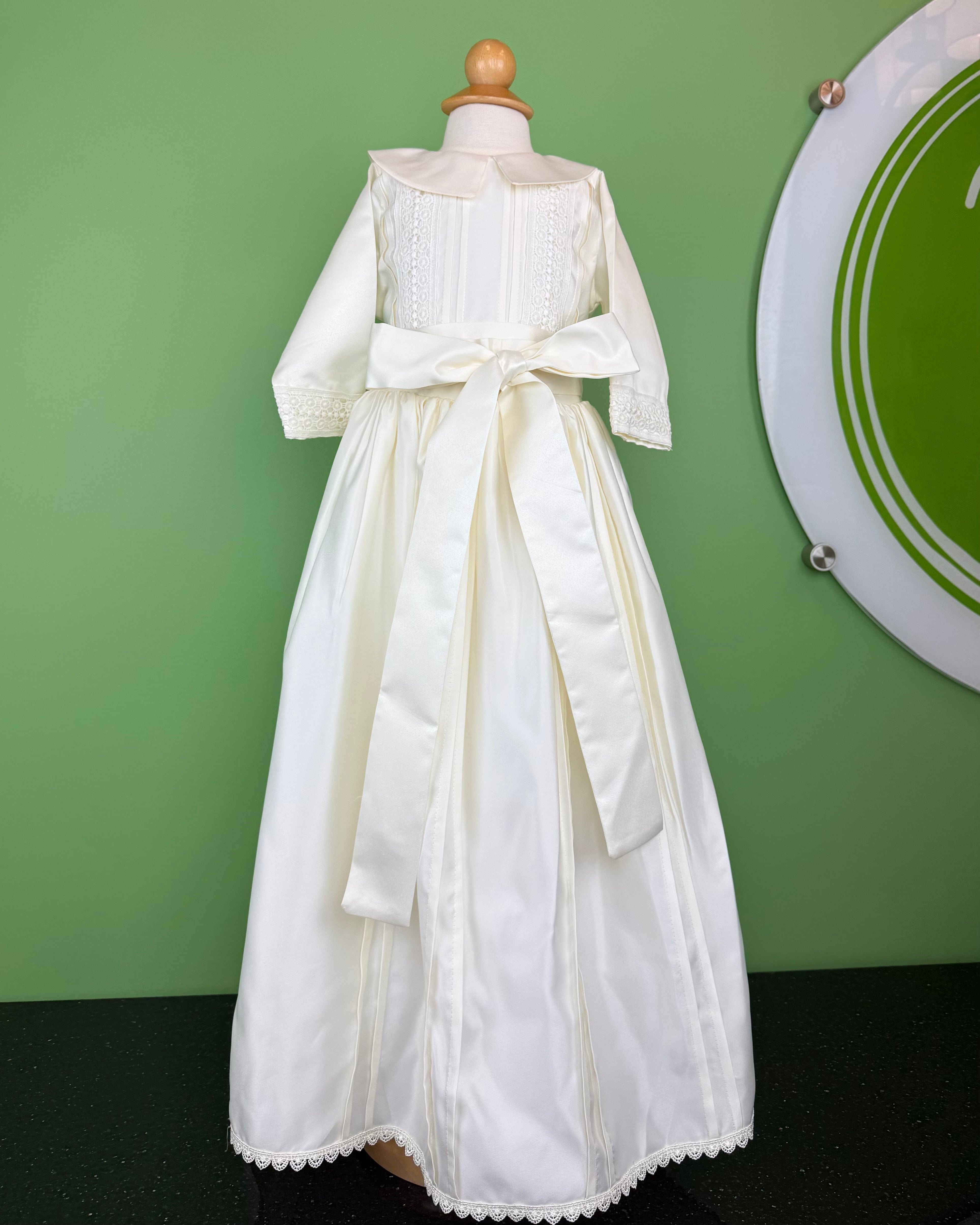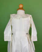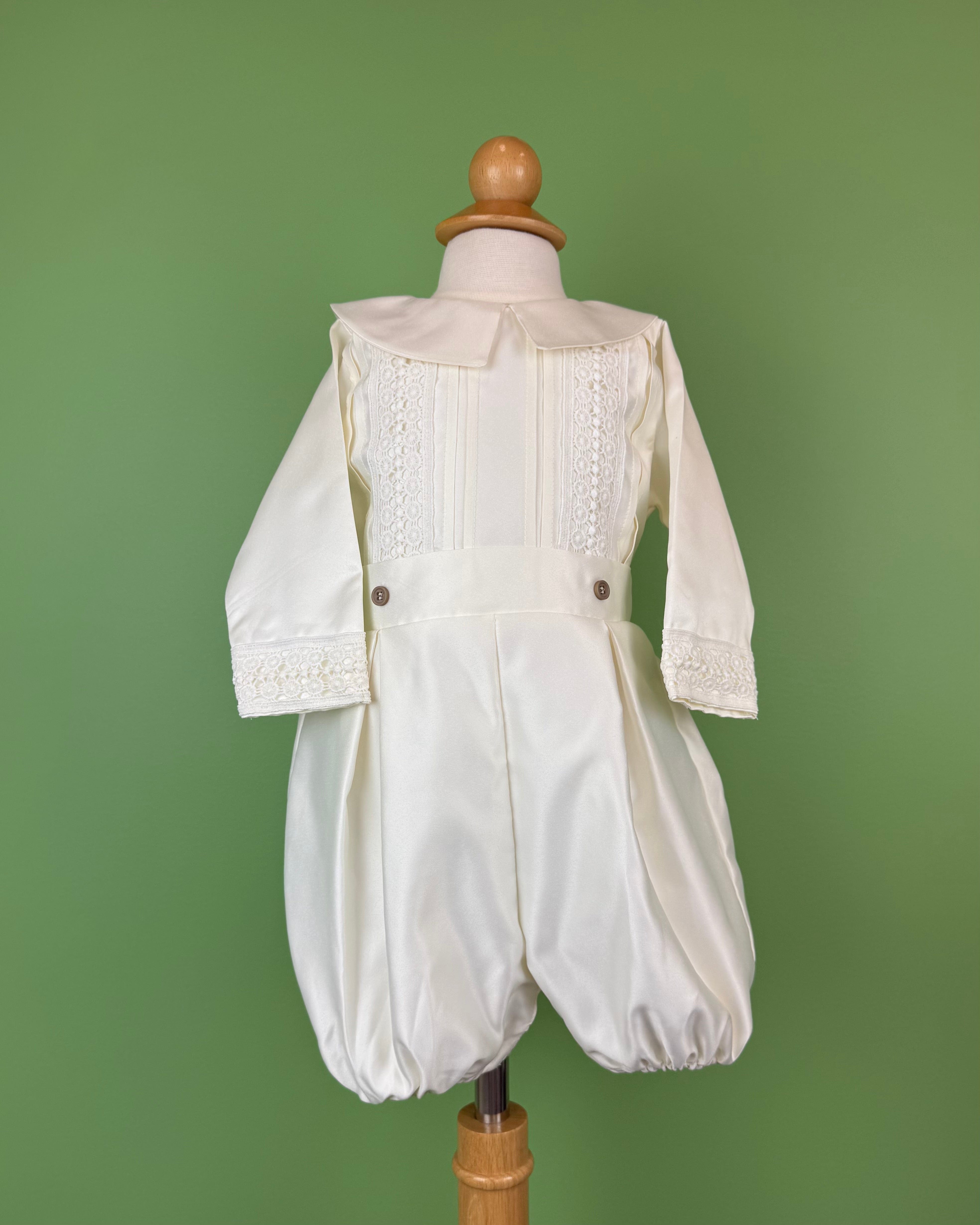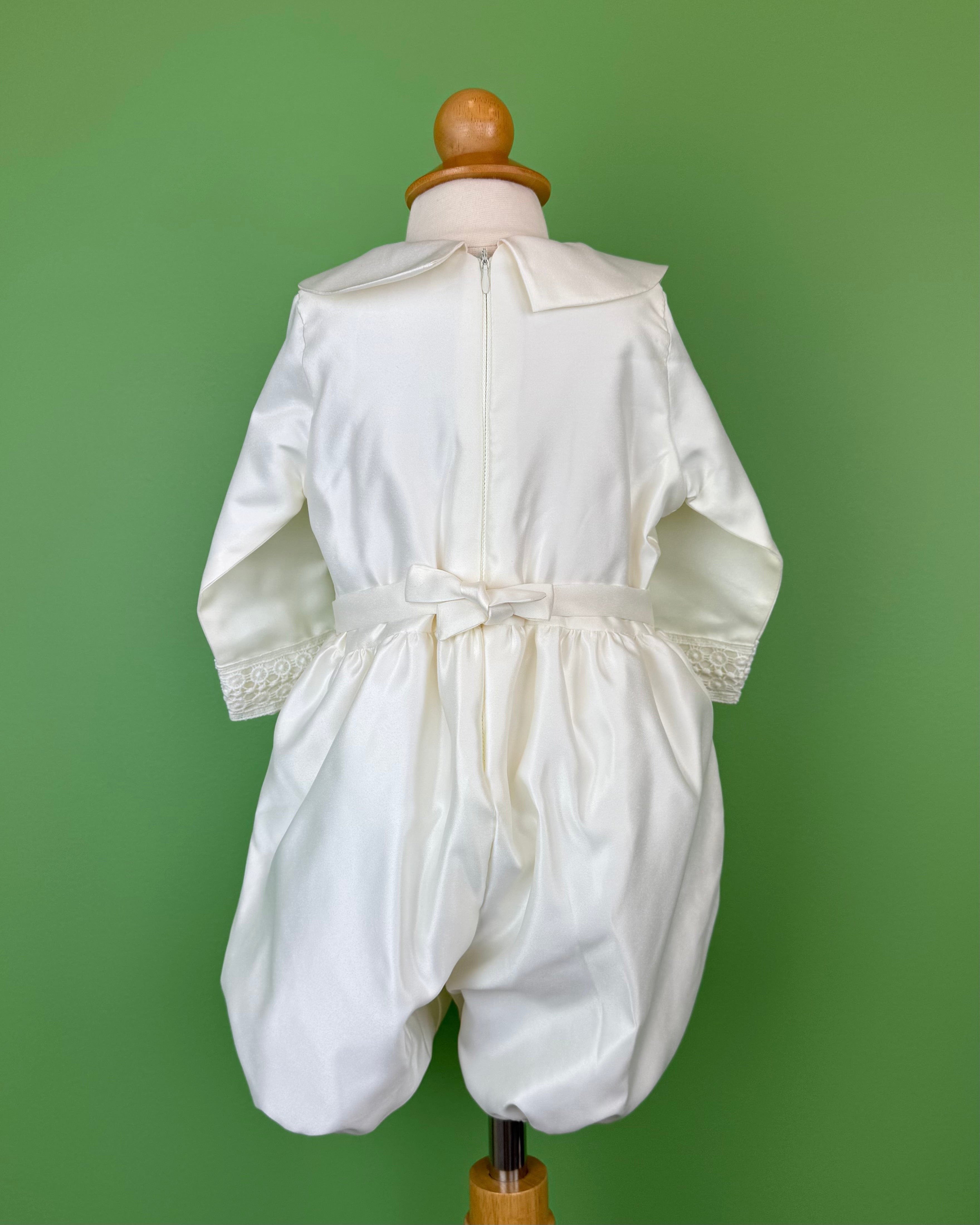 Tarifa is a unique christening gown that transforms into a romper, also it is a one size that will fit sizes 12 to 24 months. It is made with an ivory satin that is lightweight.