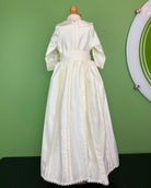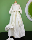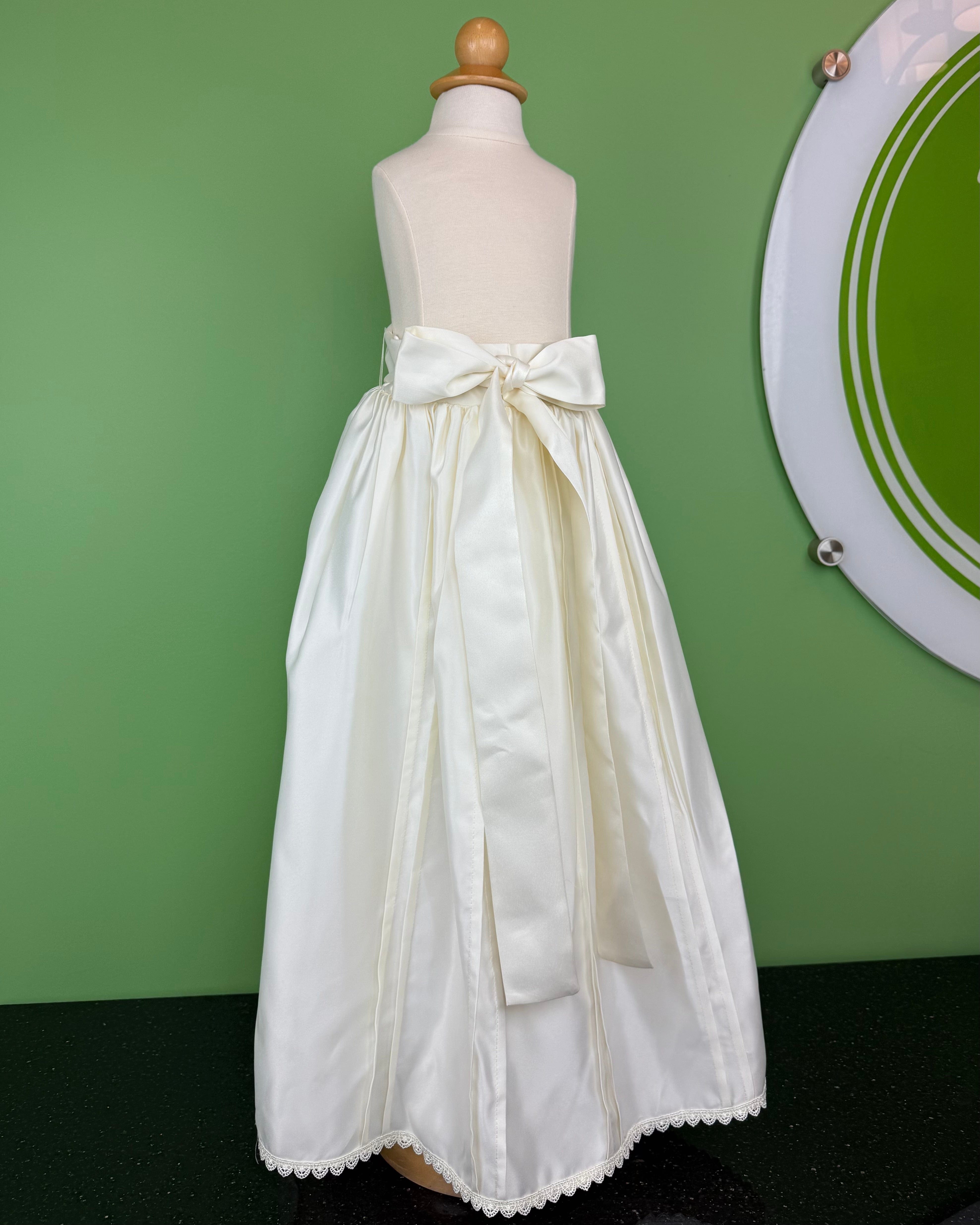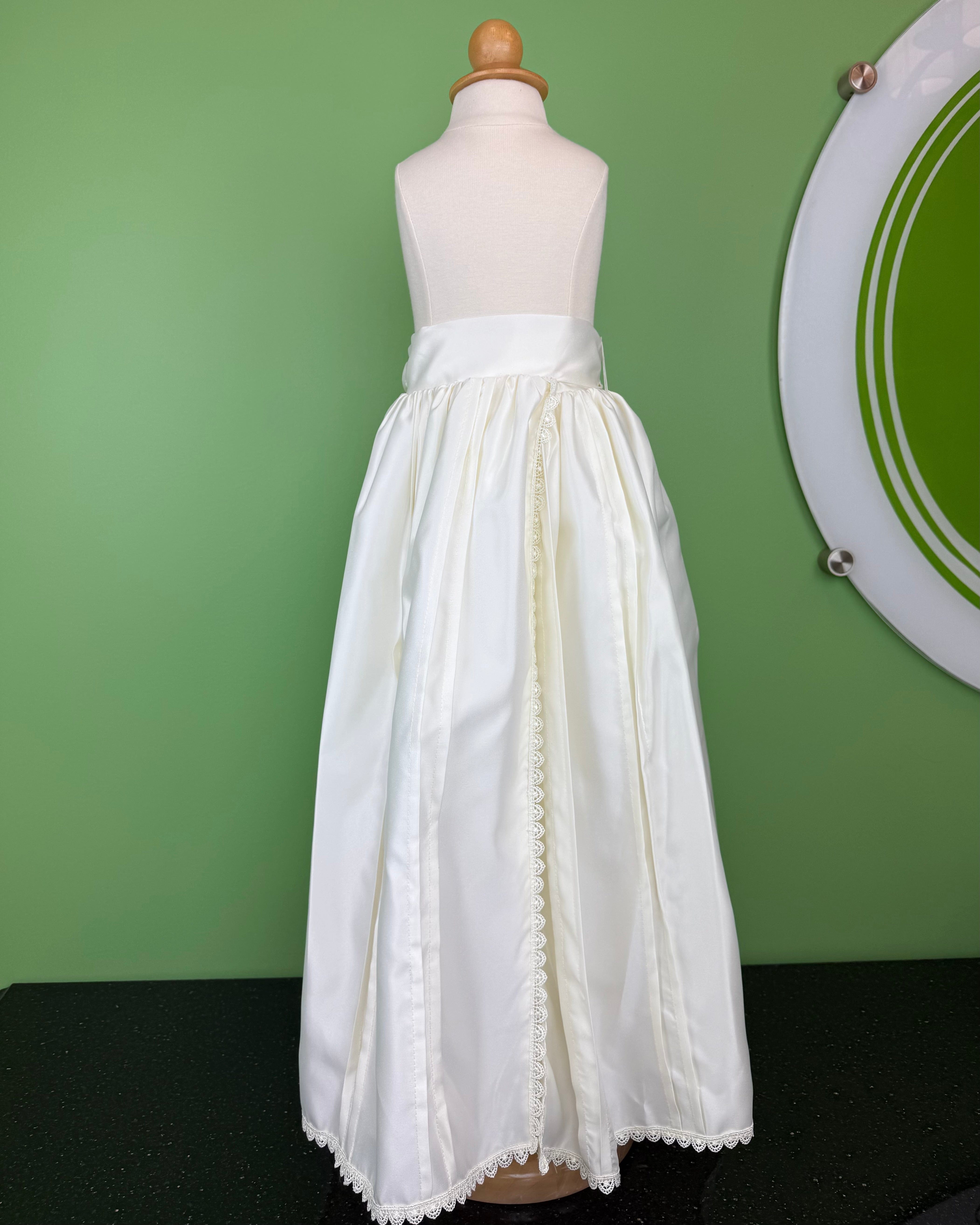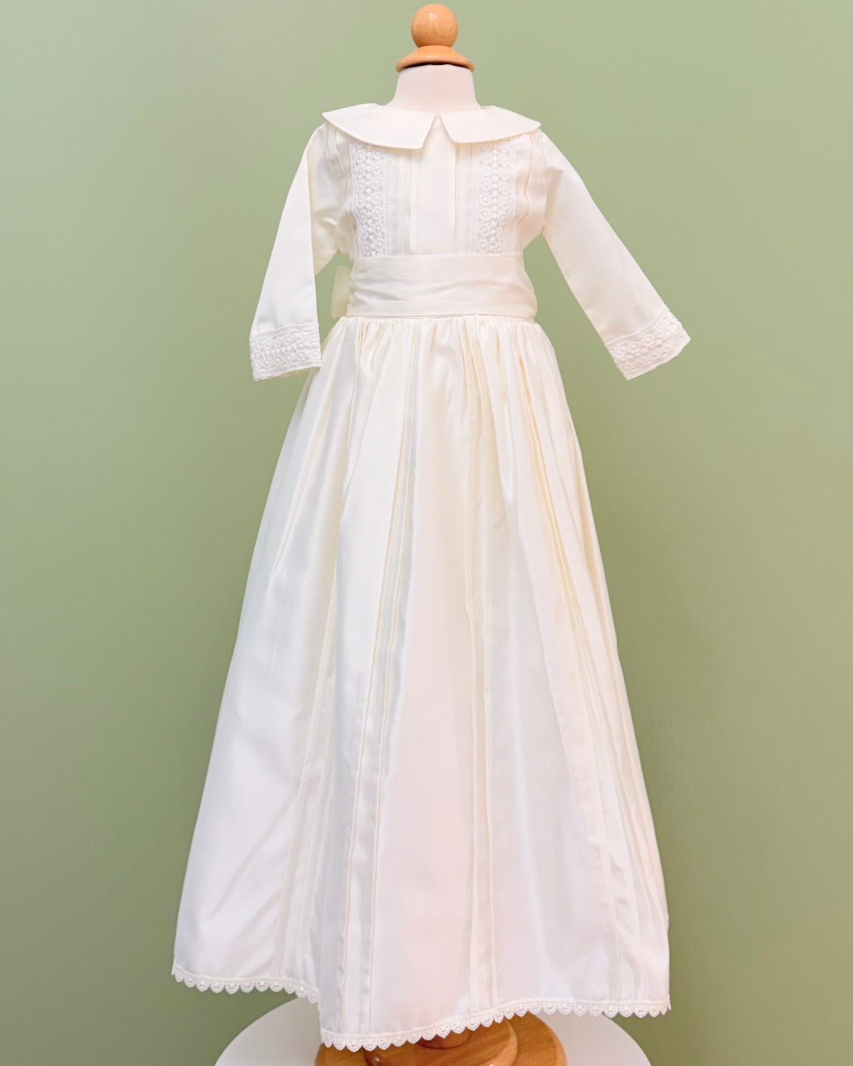 Tarifa is a unique christening gown that transforms into a romper, also it is a one size that will fit sizes 12 to 24 months. It is made with an ivory satin that is lightweight.