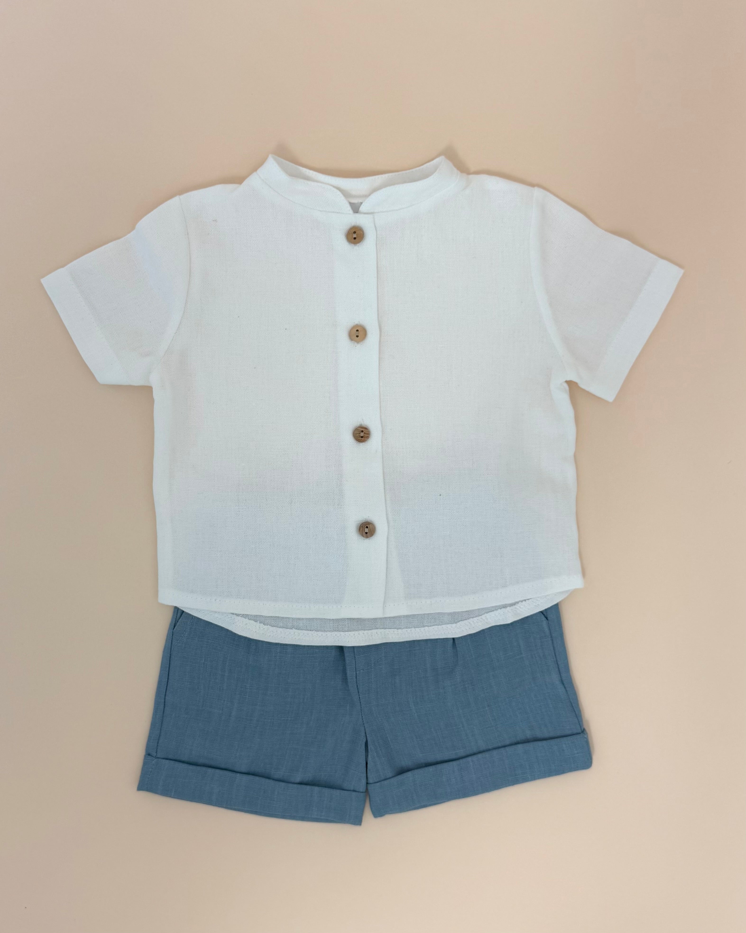 Dress your baby boy in timeless elegance with this charming two-piece set. The crisp white shirt features short sleeves, a classic mao collar, and delicate wooden buttons down the front for a refined, natural touch.