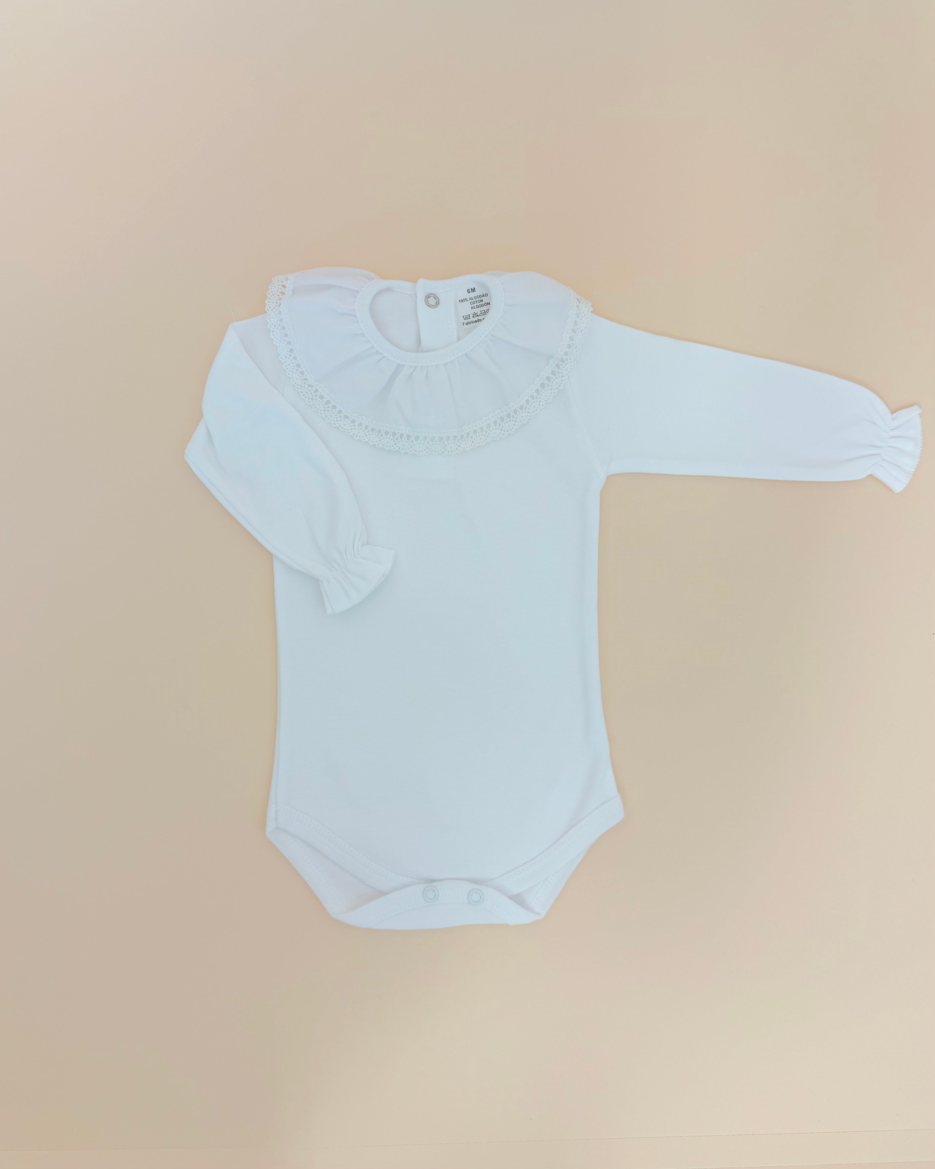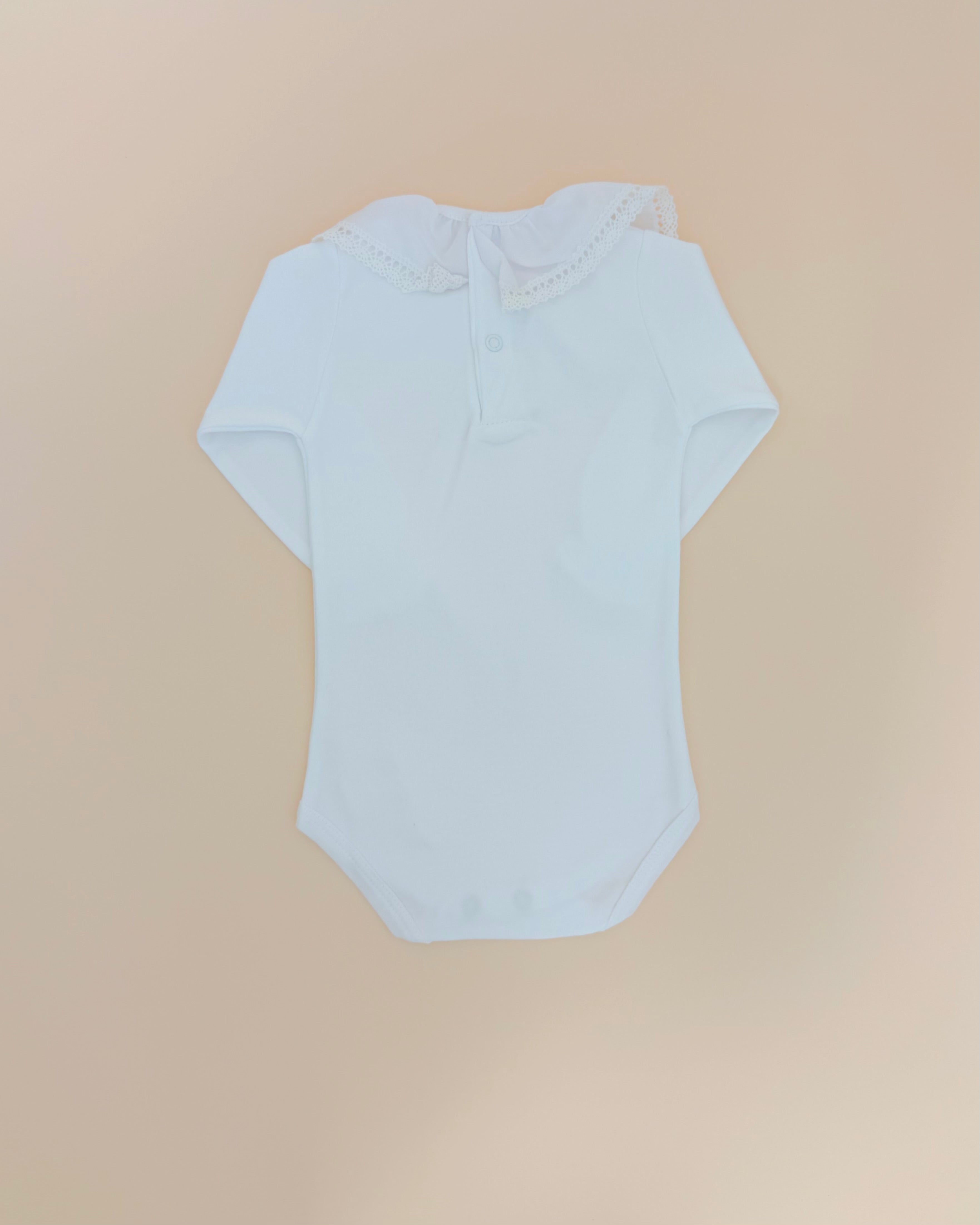 Sweet and sophisticated, this baby girl onesie features a delicate lace collar finished with a white trim, paired with long sleeves for a charming touch. Made in Portugal from premium, breathable cotton, it’s designed to feel as gentle as a mother’s embrace on your baby’s skin.