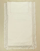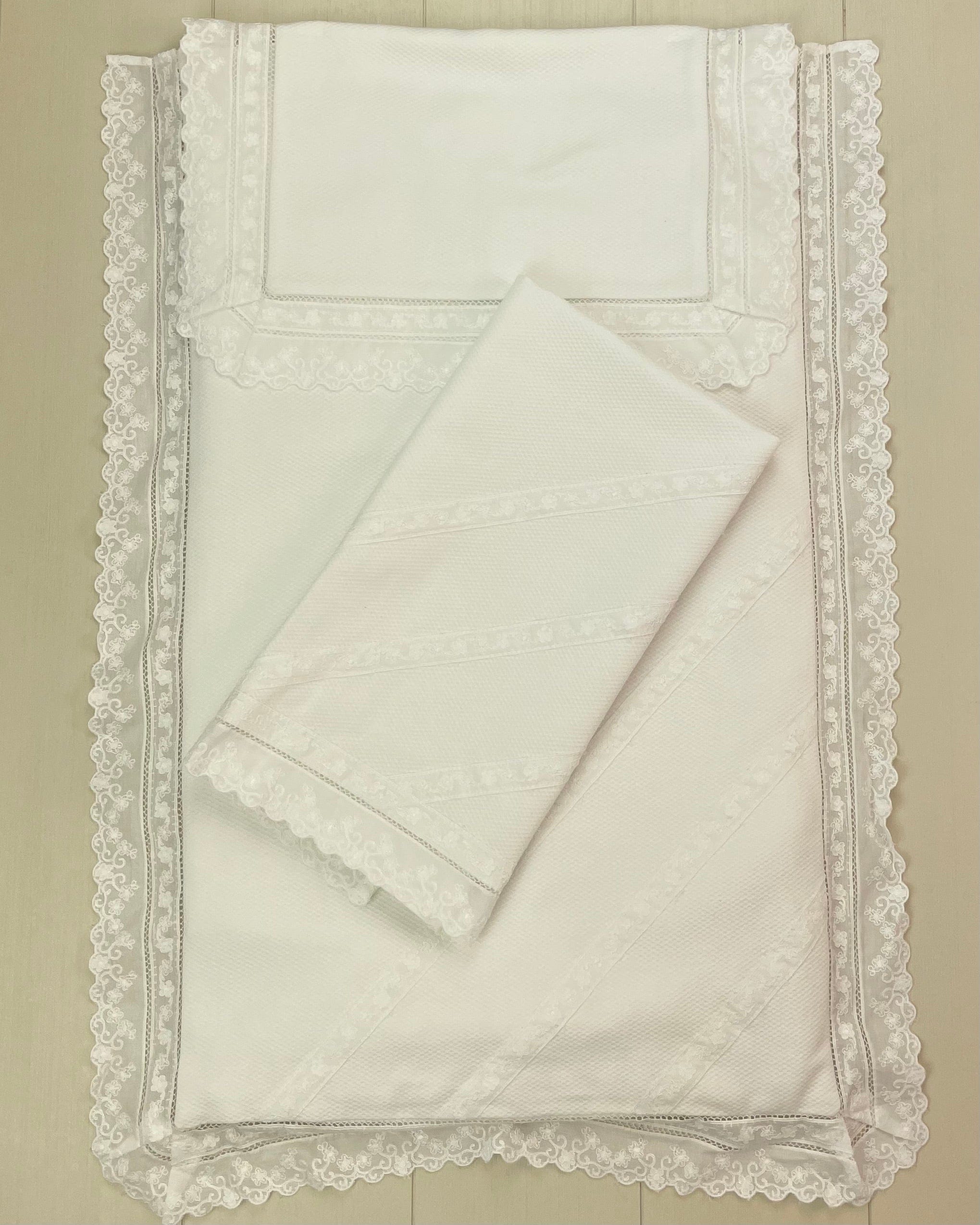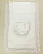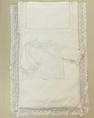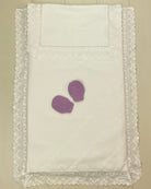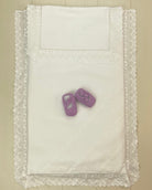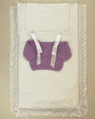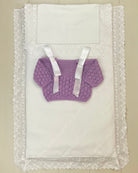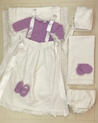 A delicate and unique nine-piece set for a newborn baby, made with lightweight cotton fabric, purple knit, and laces. It includes mittens, shoes, bloomers, bonnet, blanket, blouse, sweater, skirt, and quilted bed.