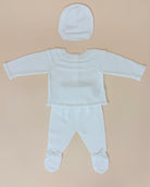 Handcrafted in Spain with premium quality and attention to detail, the set includes a knitted top with back button closure, matching footed pants, and a soft beanie for a clean and coordinated look.