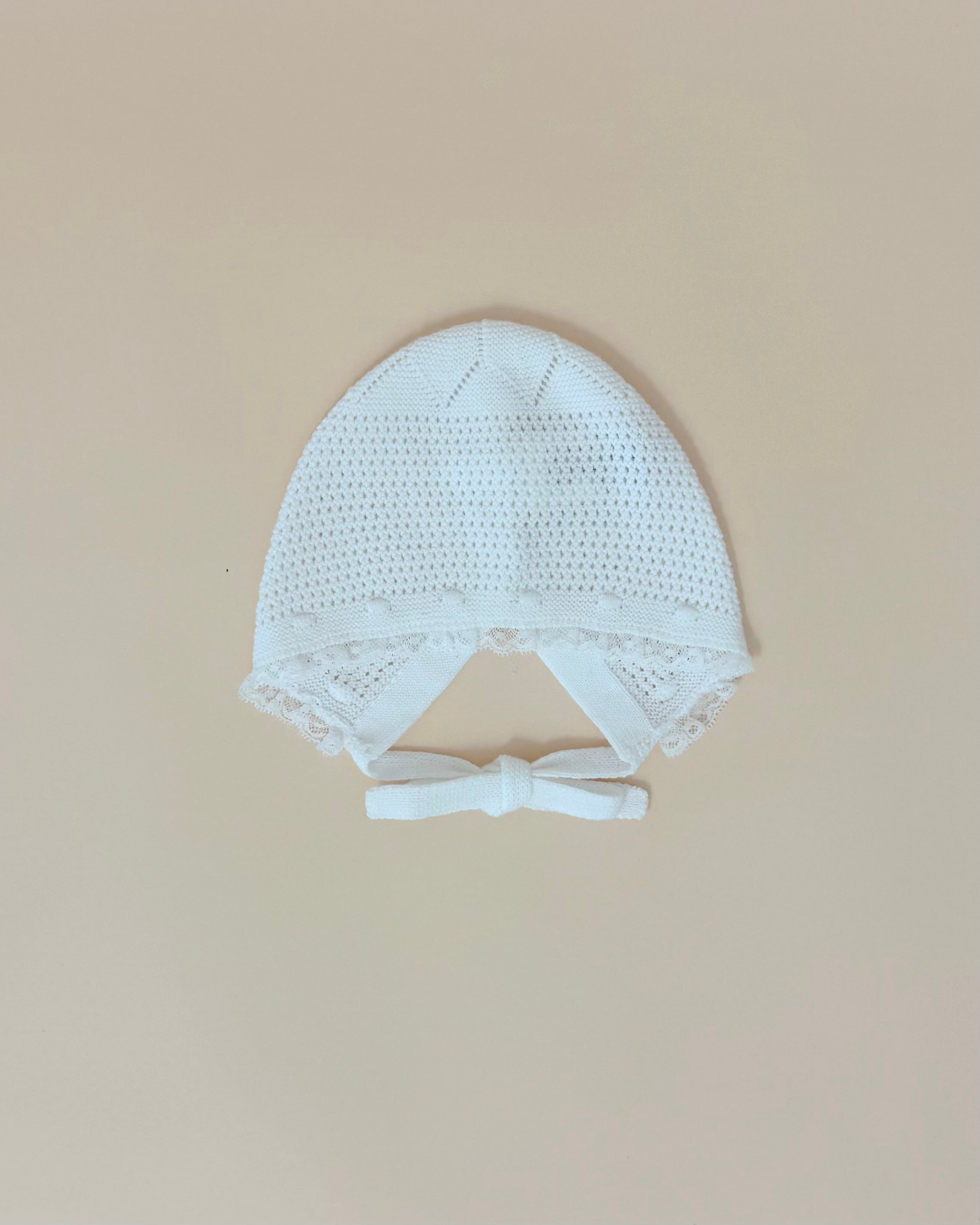 Handcrafted in Spain with premium quality, the set includes a knitted top featuring dainty lace trims and back button closure, matching footless pants, and a coordinated bonnet—a beautifully classic look for your little one’s first special moments.