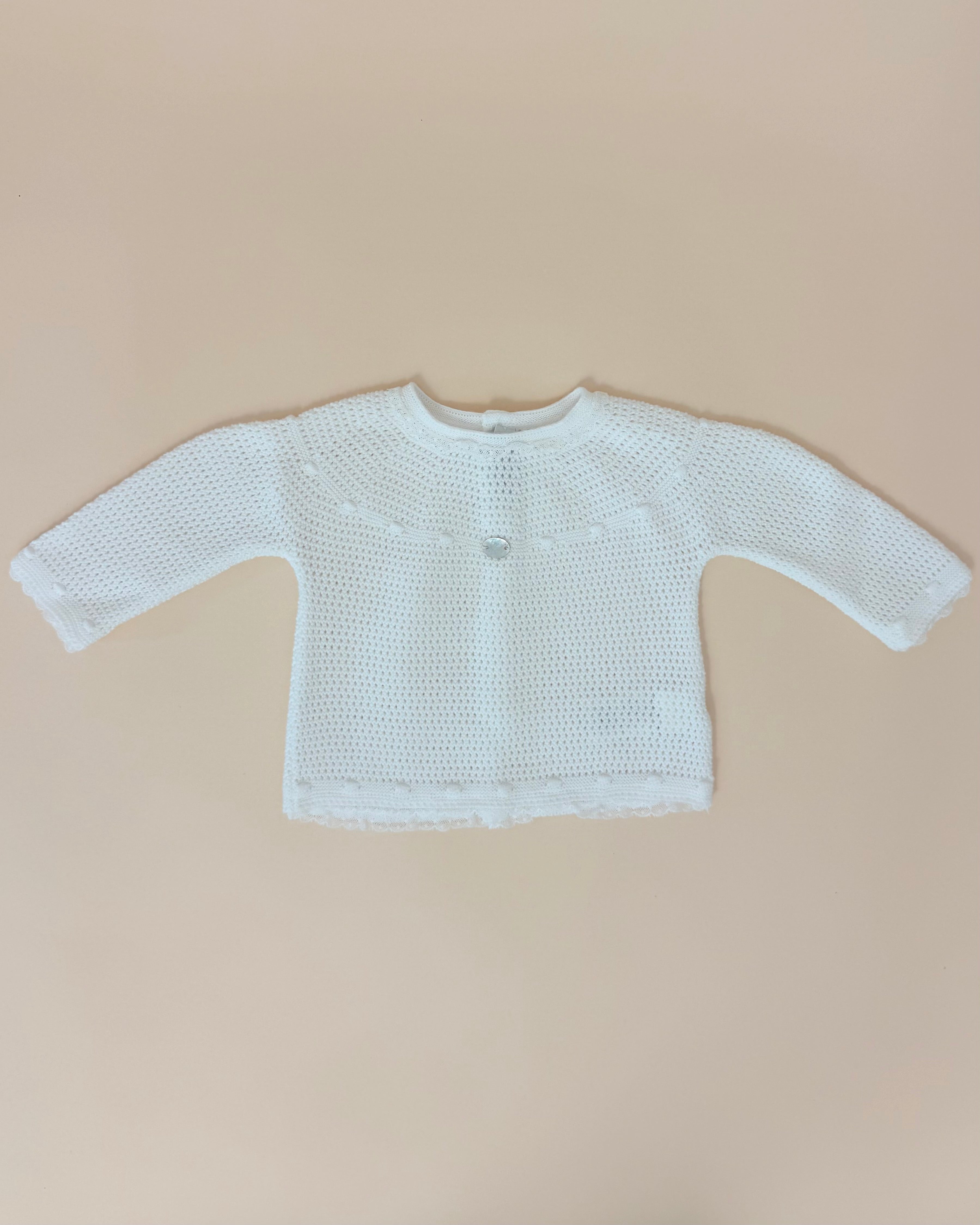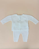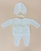 Delicate and timeless, this white knitted outfit is a graceful blend of modern simplicity and traditional elegance, designed to welcome your baby girl with softness and style.