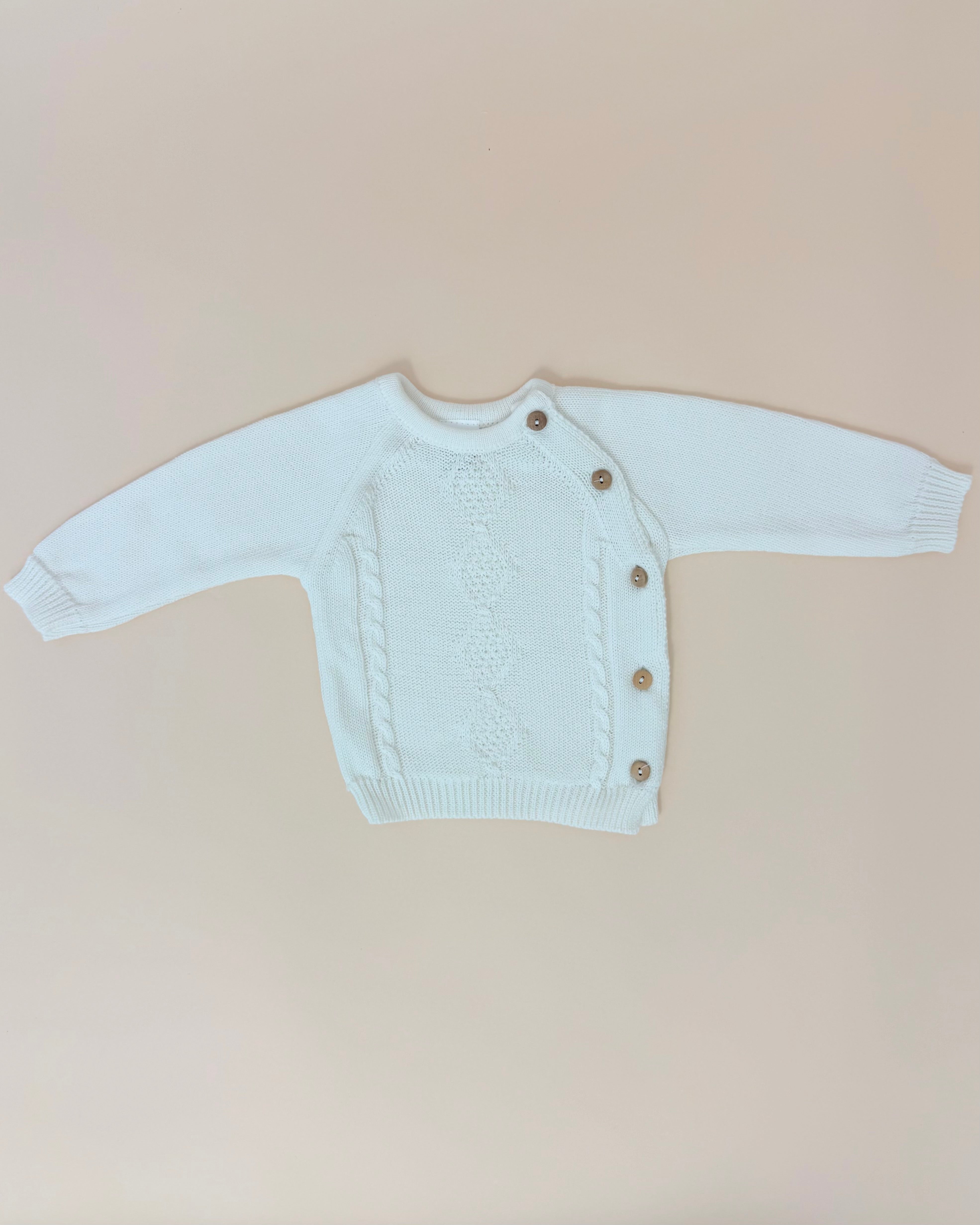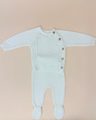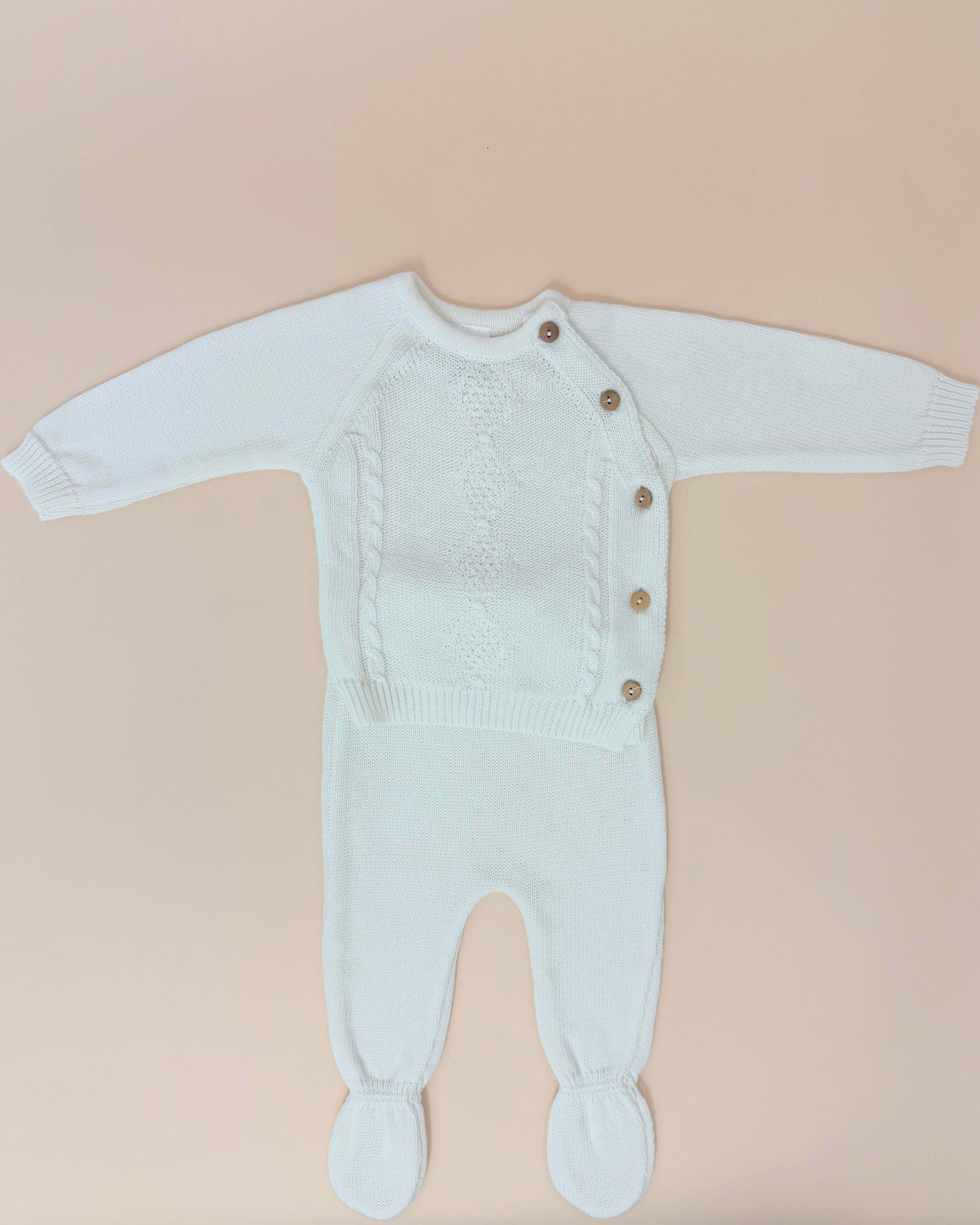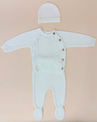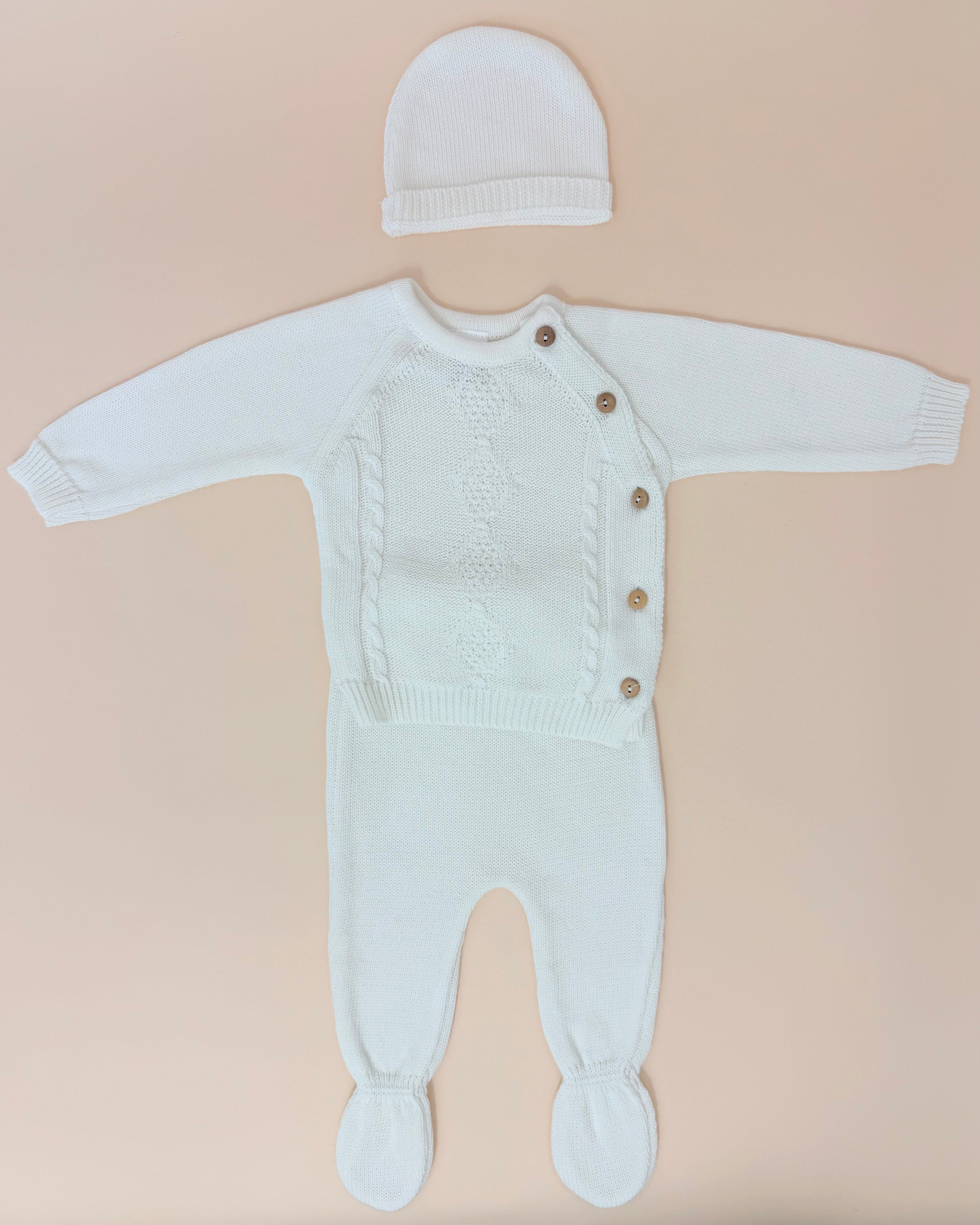 Simple, timeless, and beautifully crafted, this three-piece set in soft white knit is a perfect gender-neutral choice for newborn babies. Made from 100% cotton, it offers exceptional softness and breathability—ideal for a newborn's delicate skin.