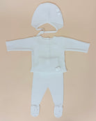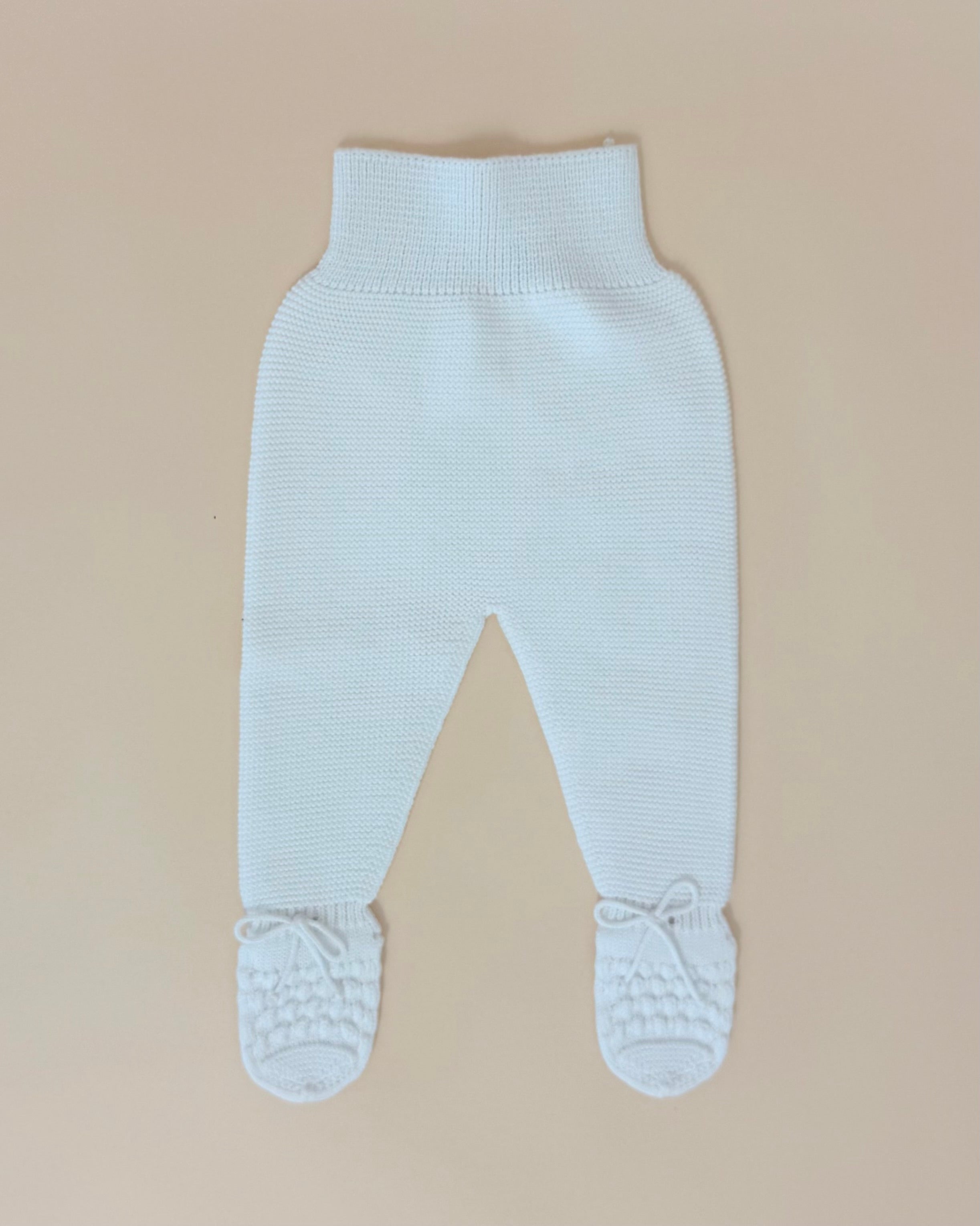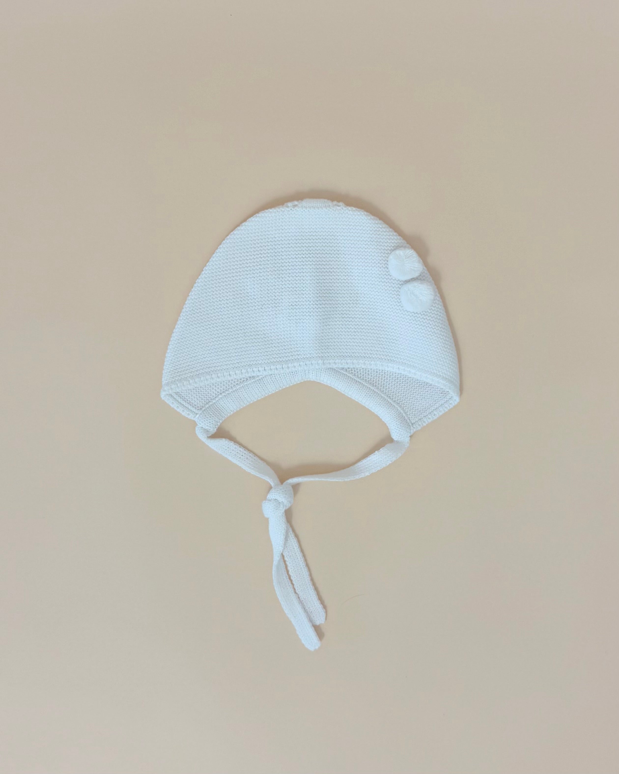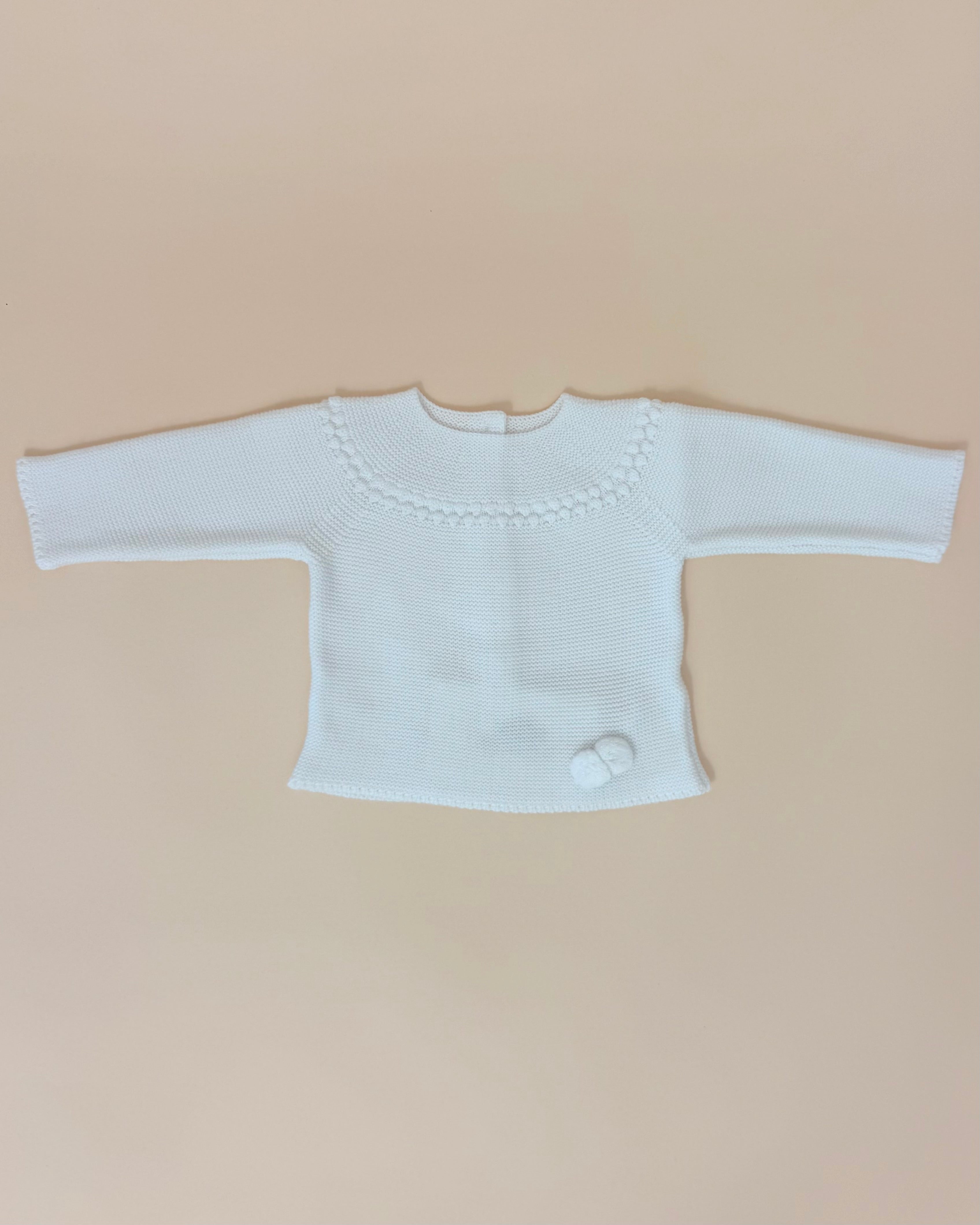 Handcrafted in Spain with exceptional attention to detail, the set includes a knitted top with back button closure and two soft pompoms, matching footed pants, and a coordinated bonnet also adorned with two playful pompoms—creating a cozy and picture-perfect look.