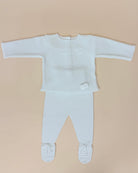Sweet and timeless, this white knitted outfit is a delightful blend of modern charm and traditional craftsmanship, designed to celebrate your baby’s first days in style.