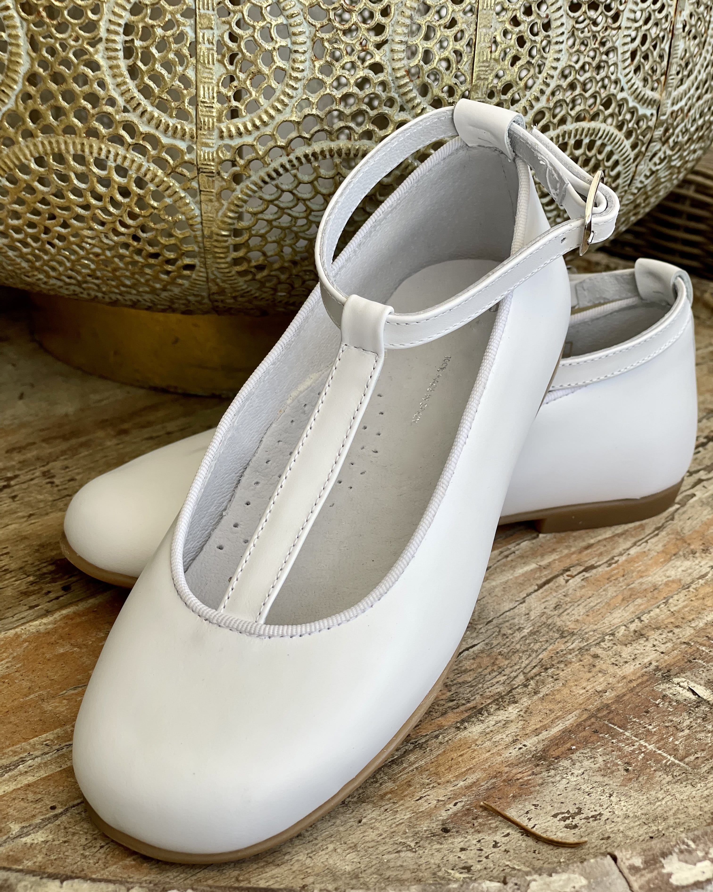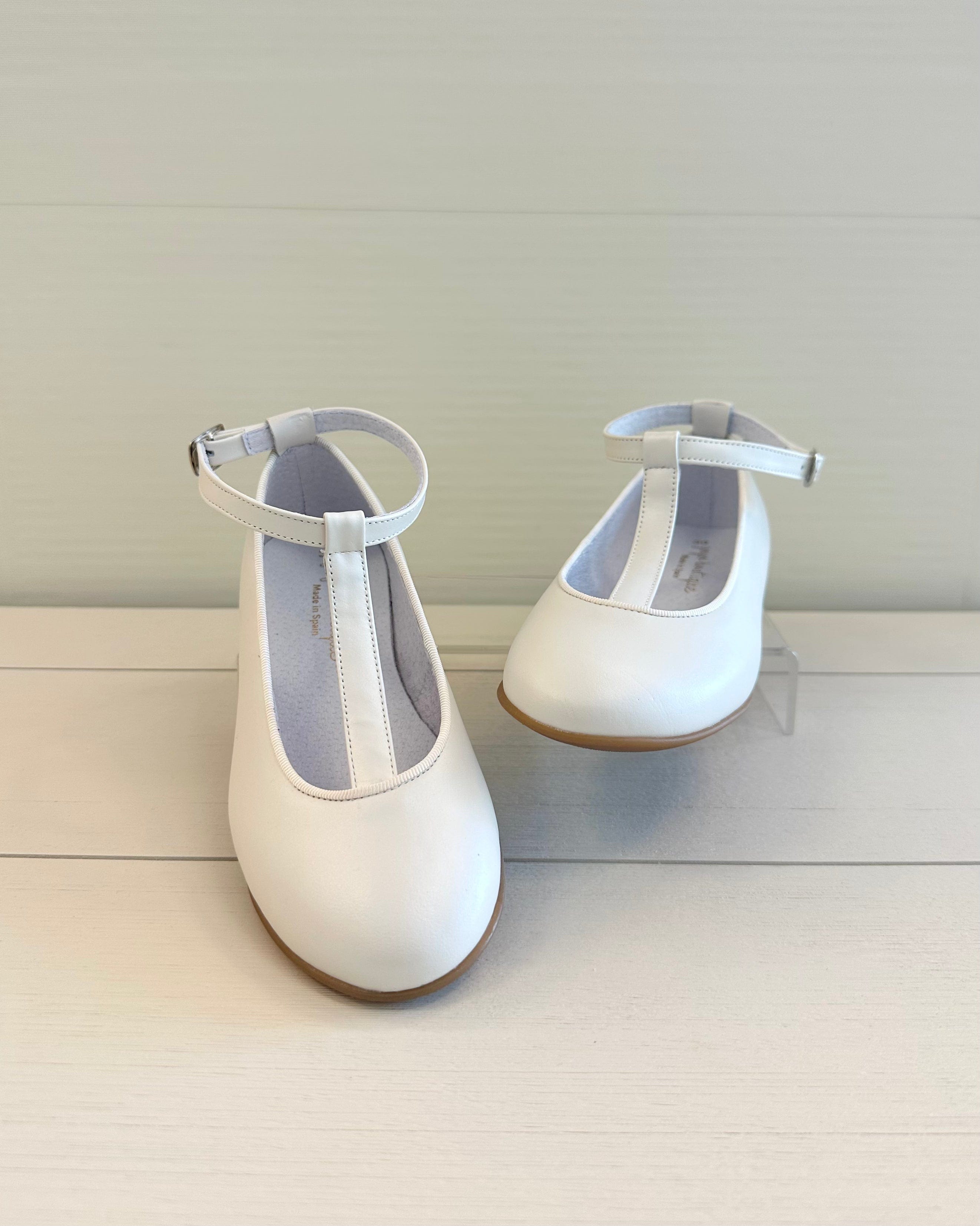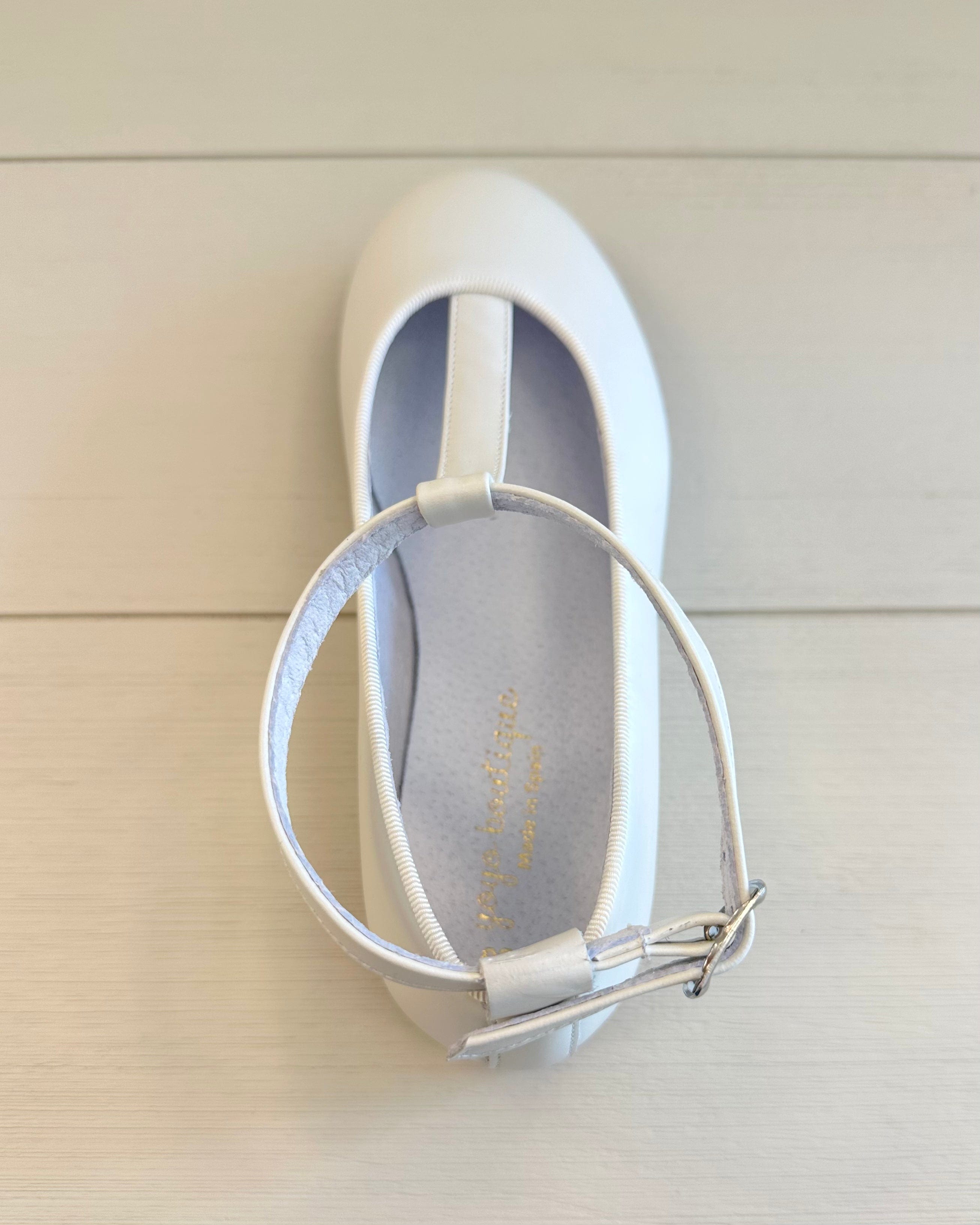 Our T-Bar Ballerina Shoes in Pearl White are the perfect blend of grace and comfort for your little girl’s most cherished moments. Designed as a classic ballerina flat, this elegant shoe features a delicate T-bar strap that anchors at the ankle and across the front of the foot, offering both style and support. Beautifully crafted in Spain, they’re ideal for First Communion, weddings, and other special occasions.
