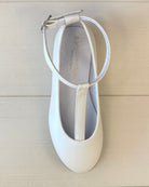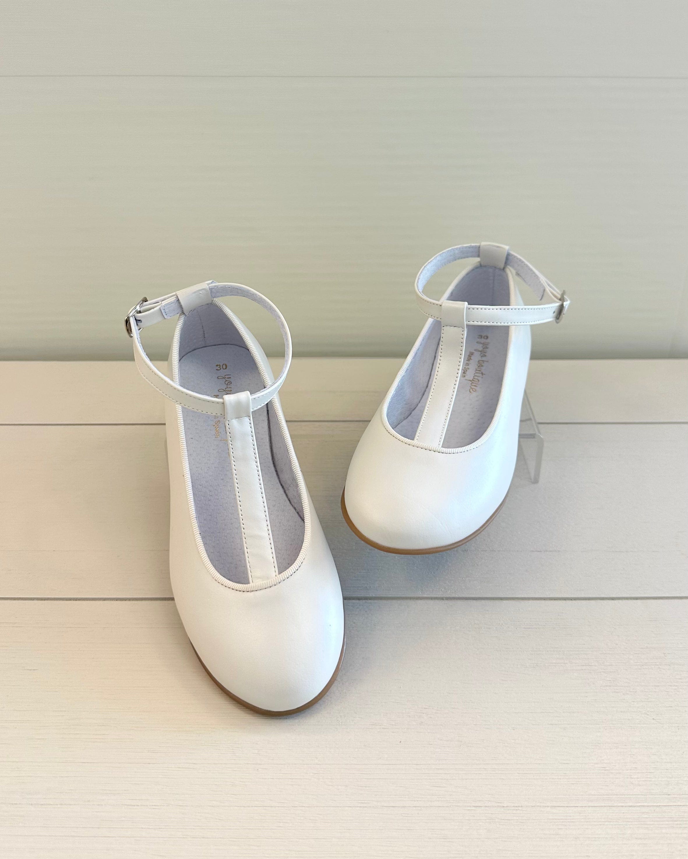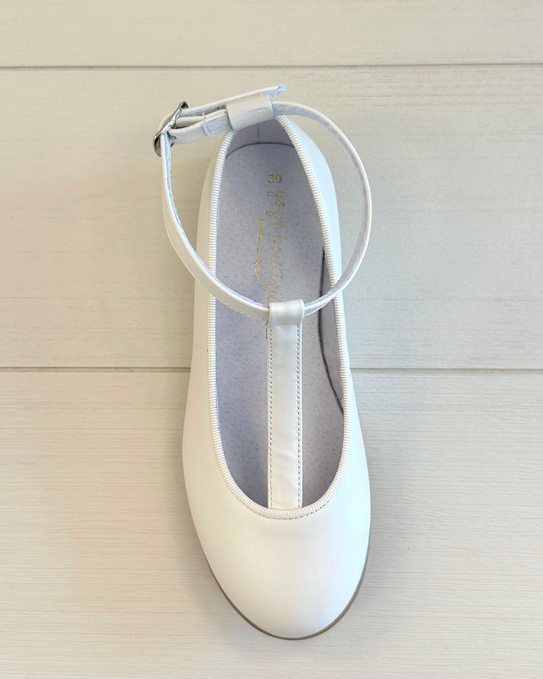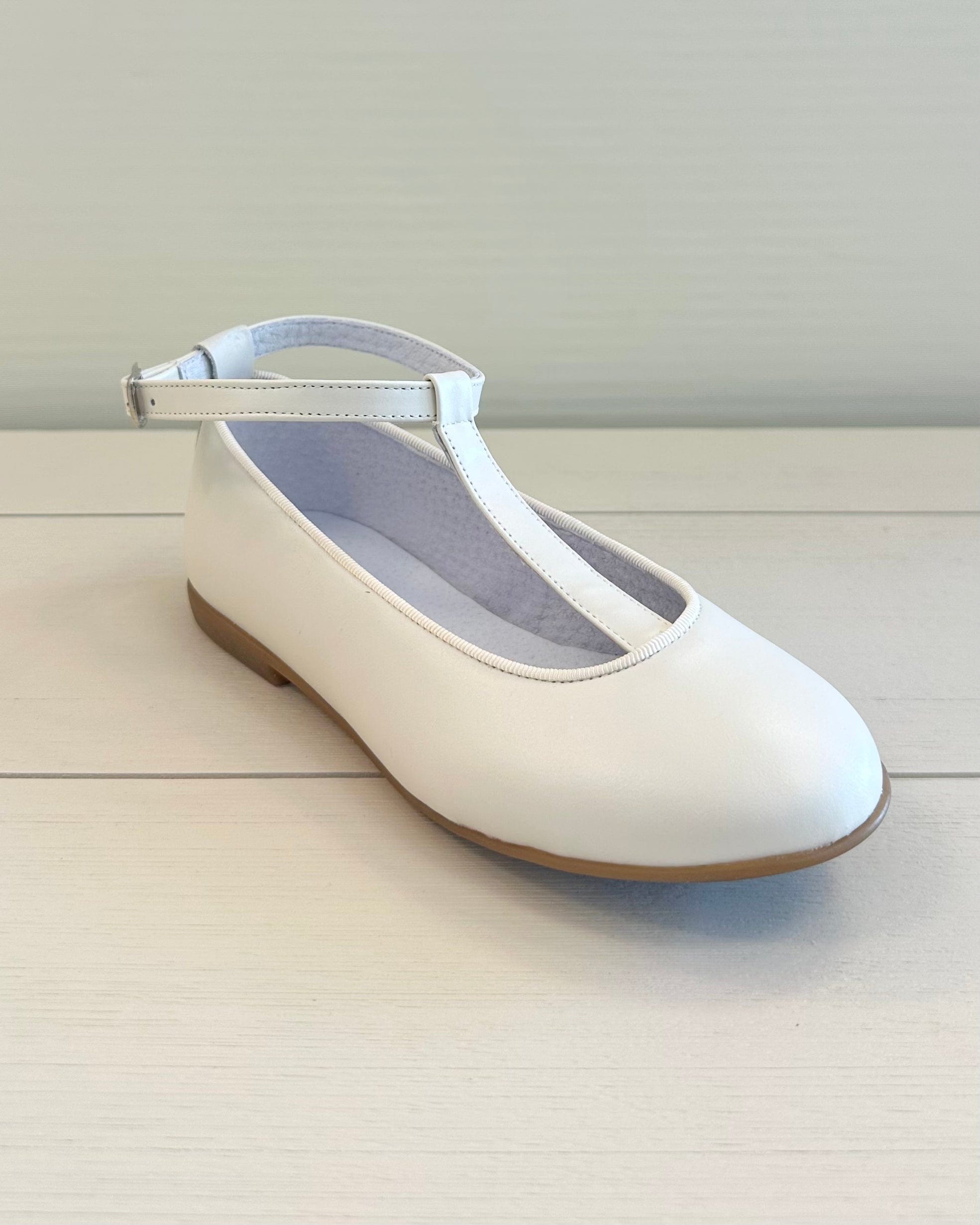 Our T-Bar Ballerina Shoes in Pearl White are the perfect blend of grace and comfort for your little girl’s most cherished moments. Designed as a classic ballerina flat, this elegant shoe features a delicate T-bar strap that anchors at the ankle and across the front of the foot, offering both style and support. Beautifully crafted in Spain, they’re ideal for First Communion, weddings, and other special occasions.