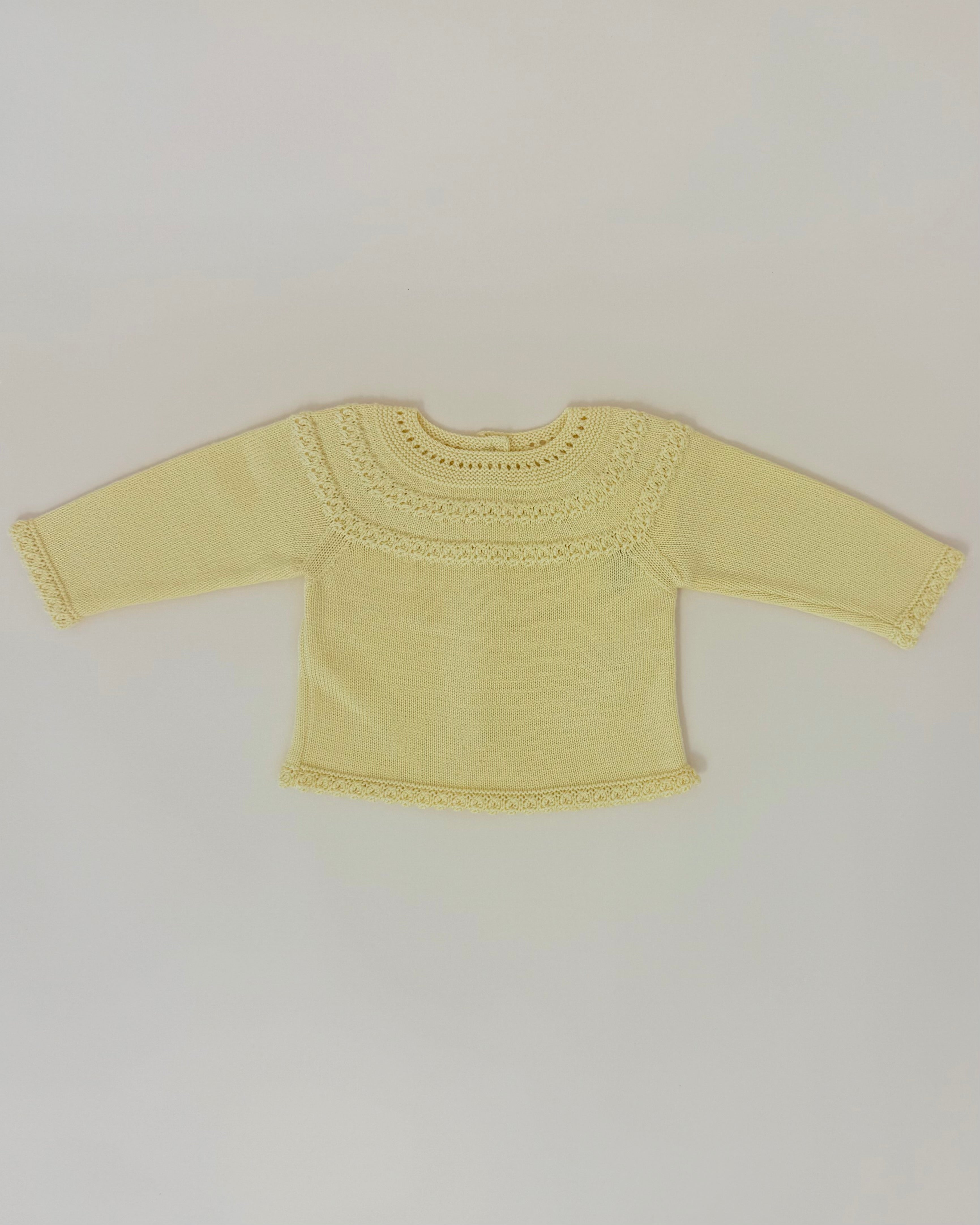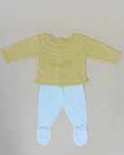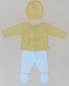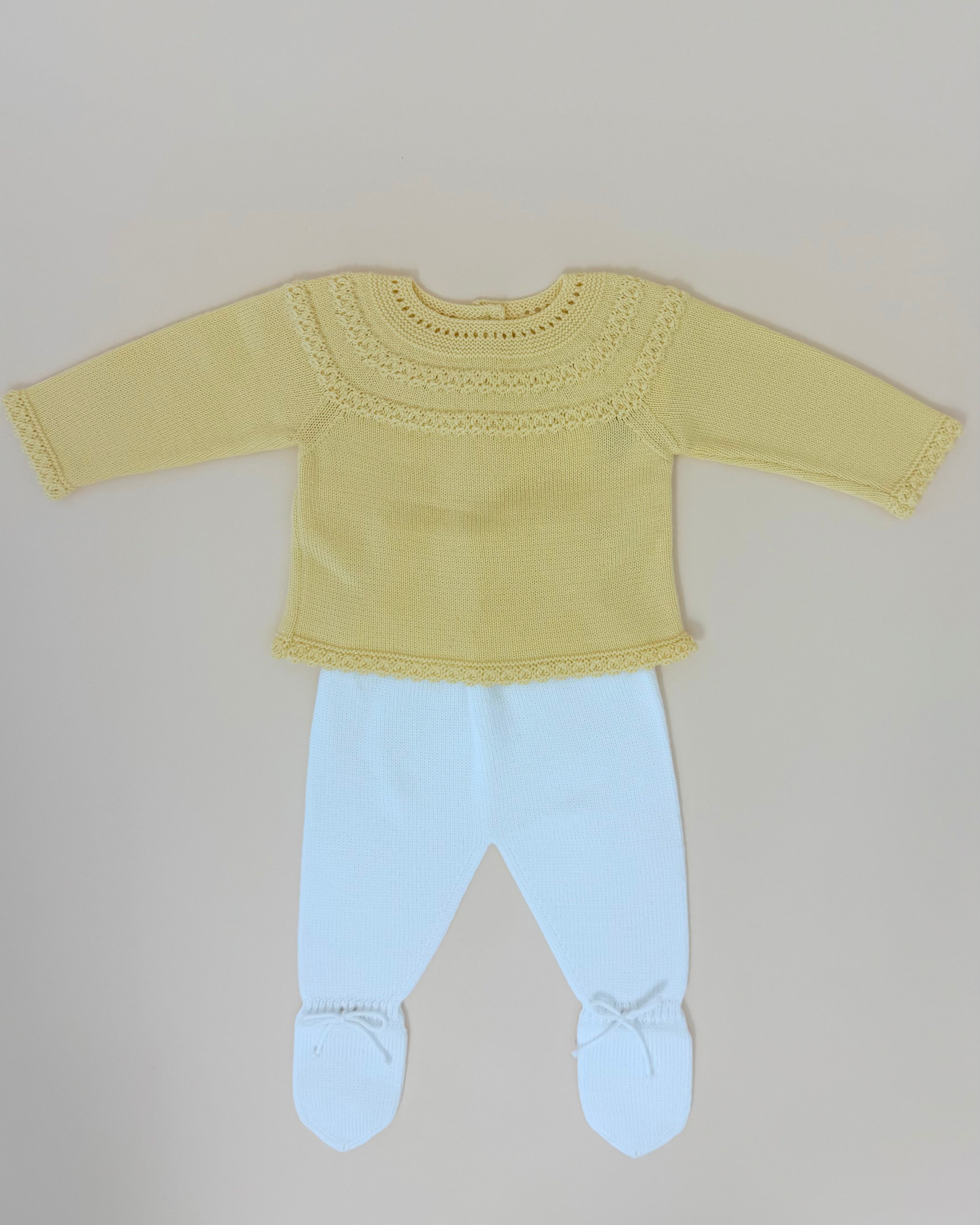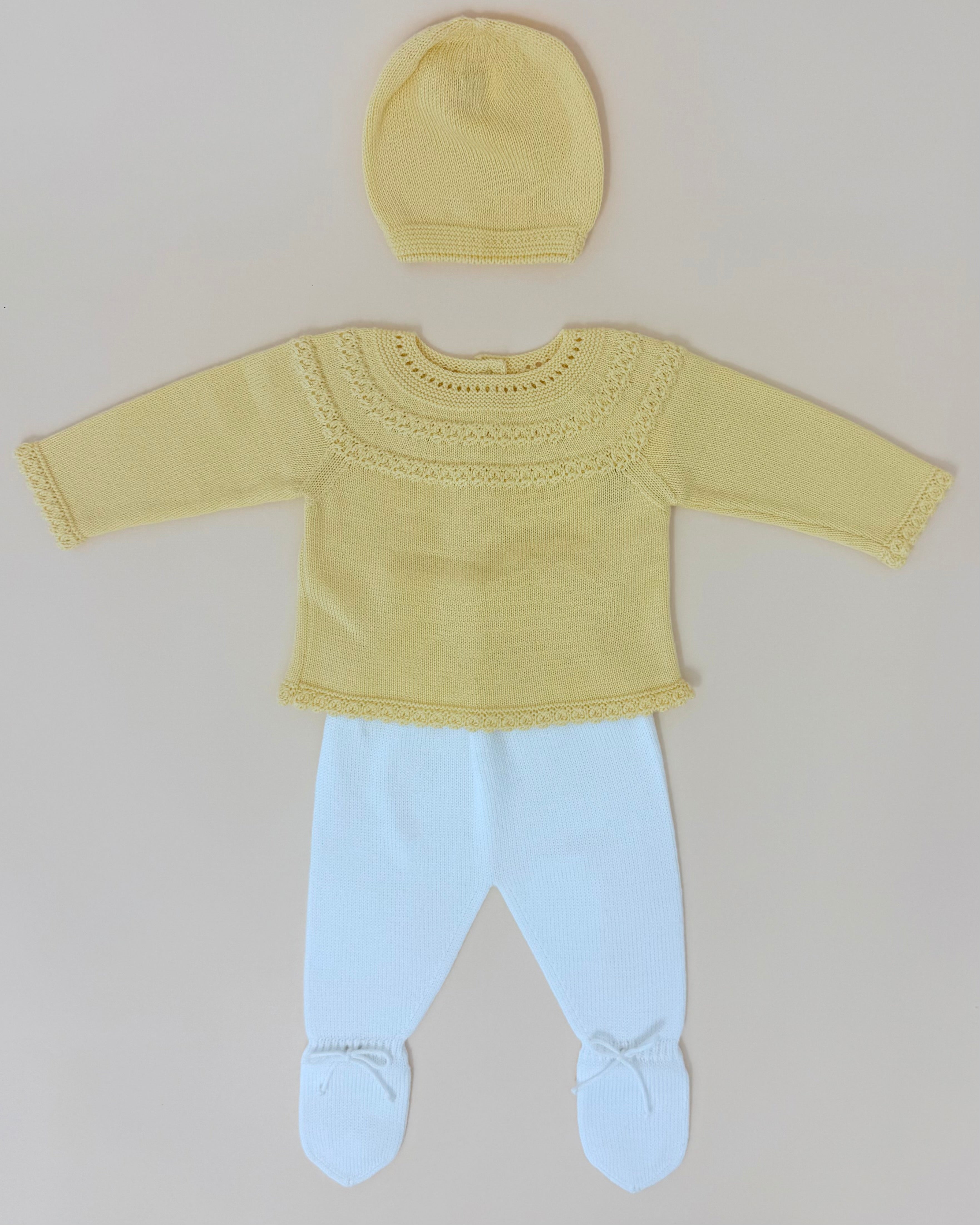 Bright, gentle, and timeless—this yellow and white knitted outfit is a beautifully classical and traditional ensemble, thoughtfully designed to welcome your little one in comfort and style.