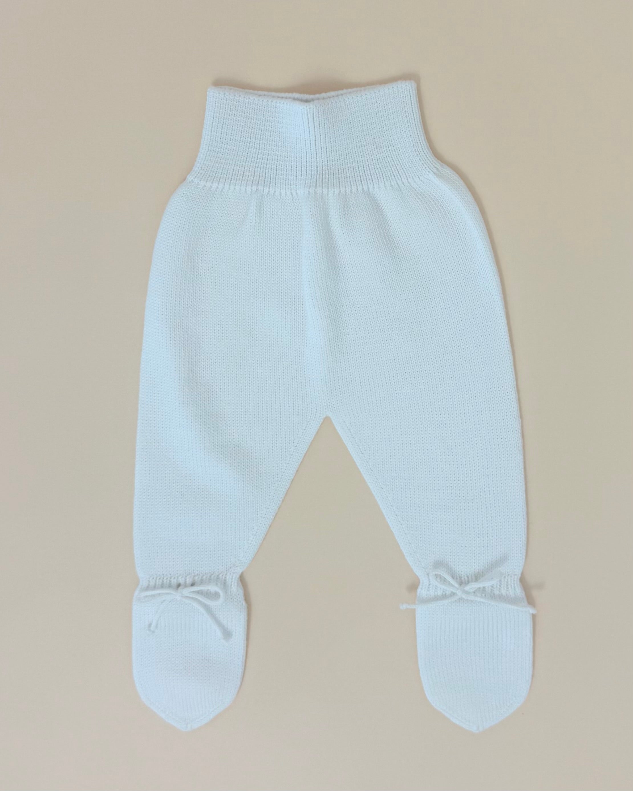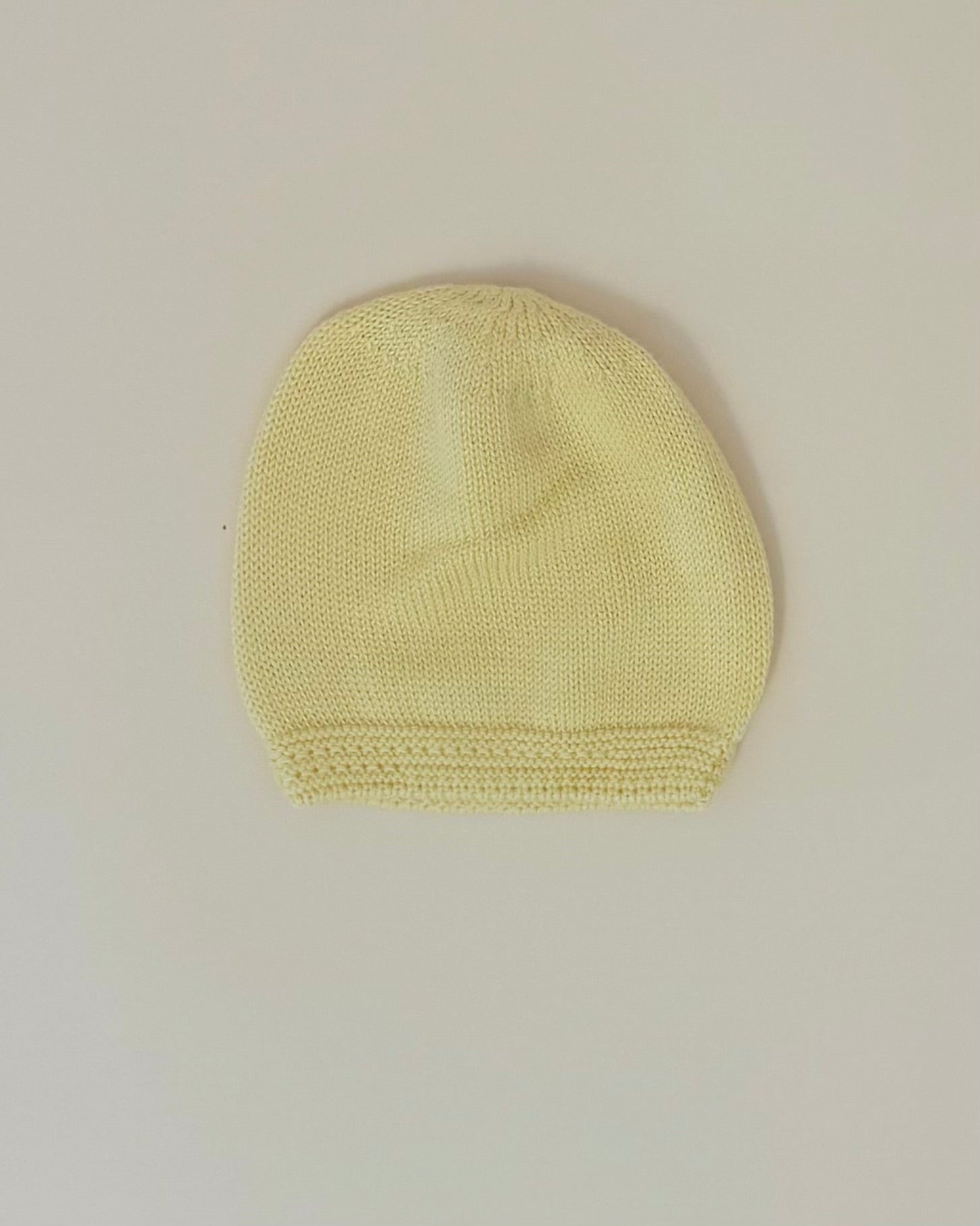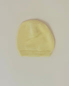 Handcrafted in Spain with exceptional attention to detail, the set includes a sunny yellow knitted top with back button closure, white footed pants, and a matching yellow beanie—creating a warm and harmonious look that’s perfectly gender-neutral.