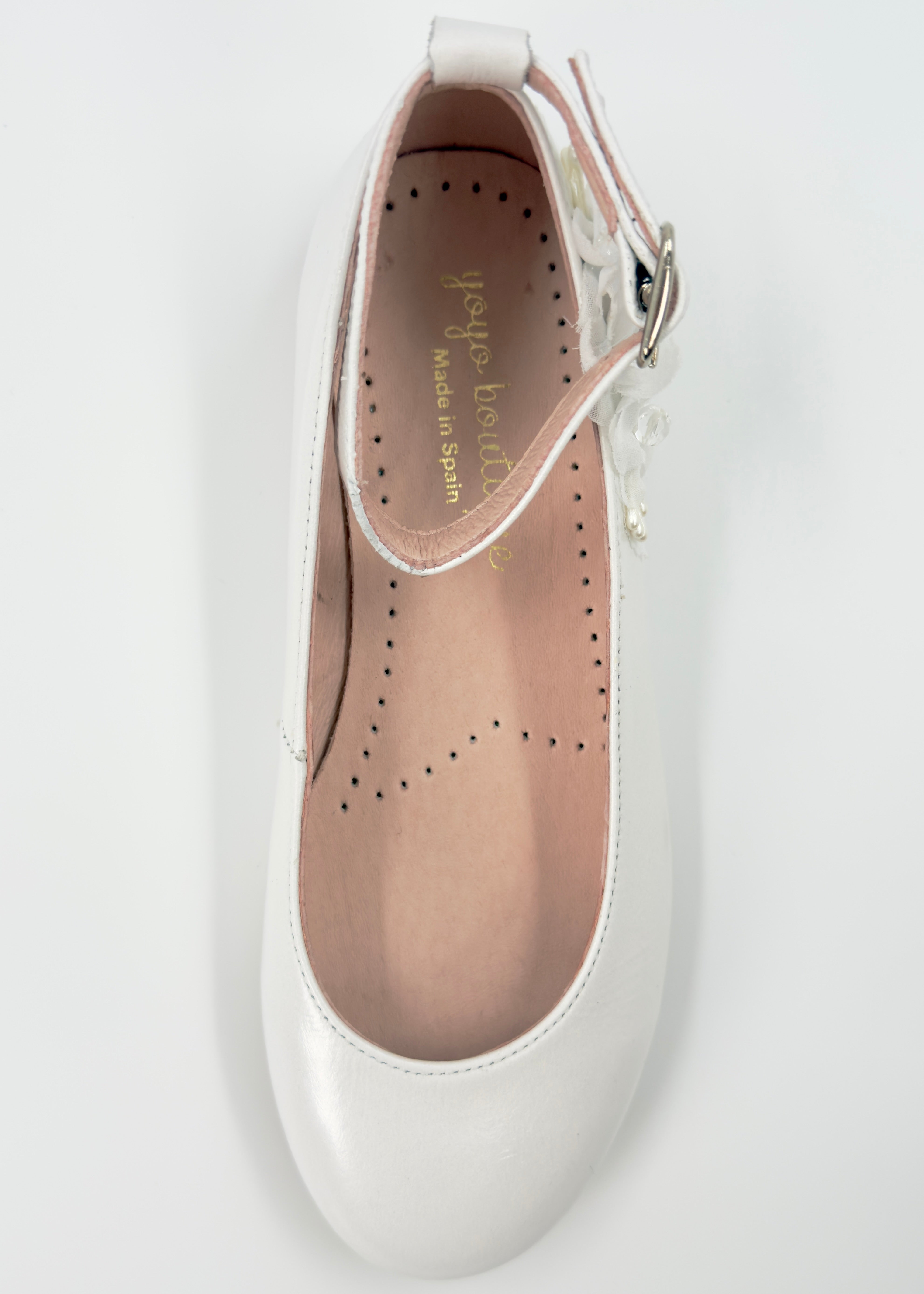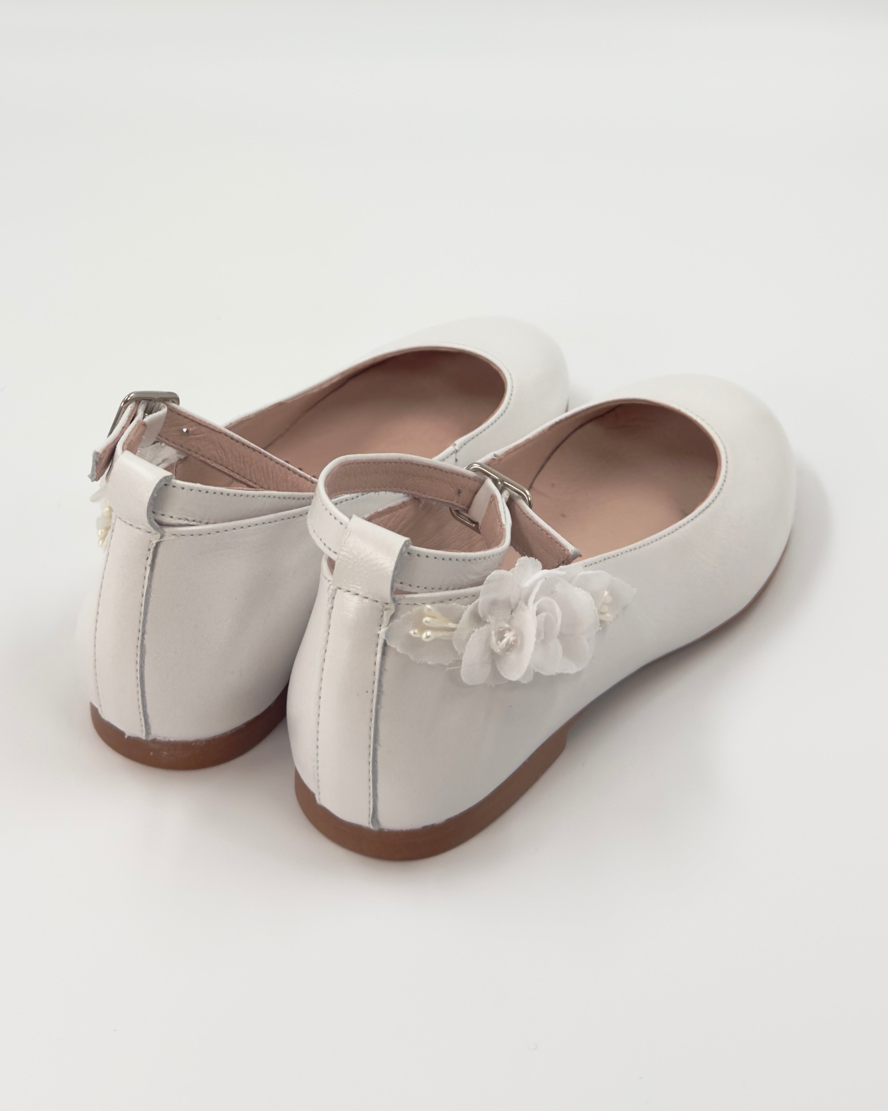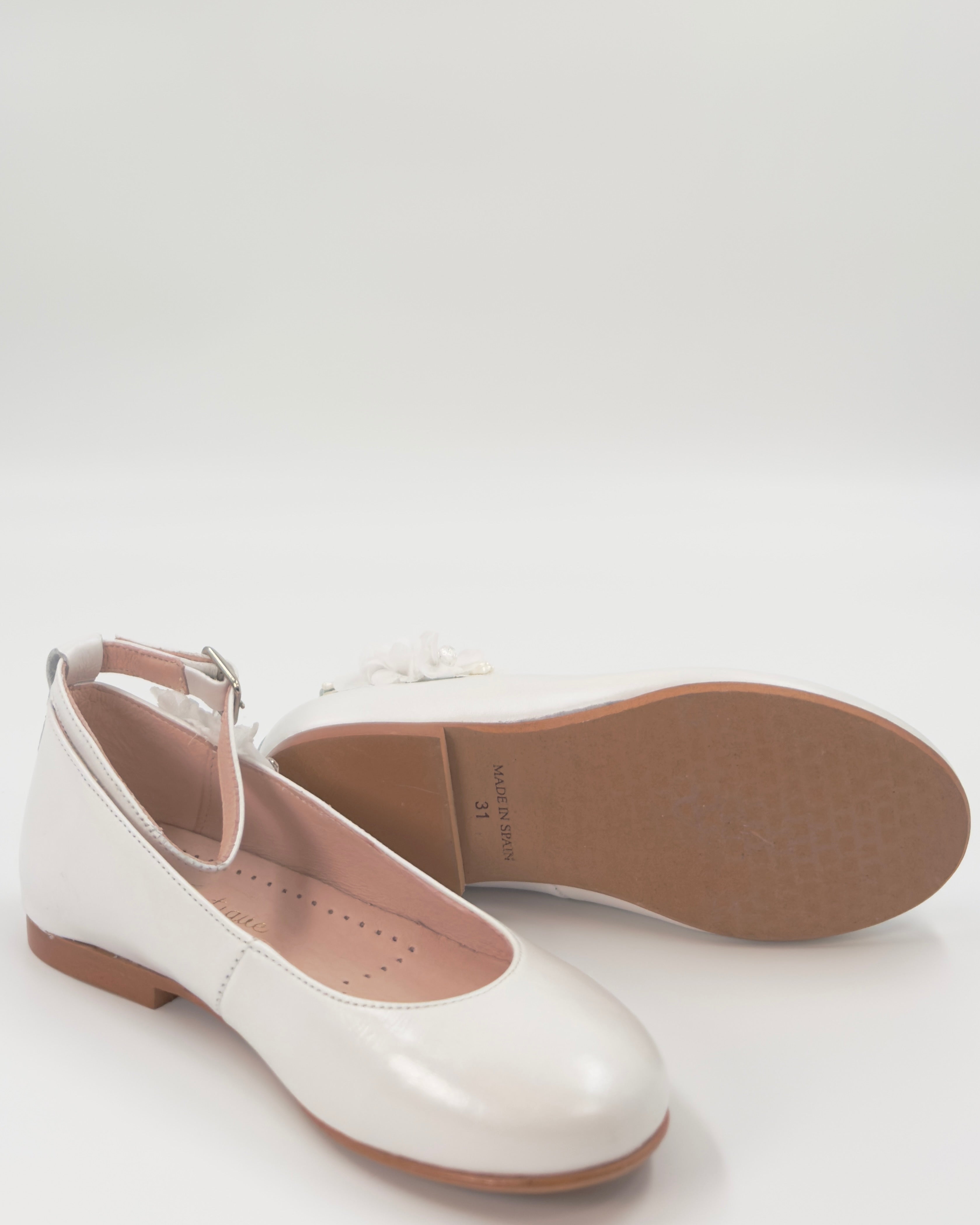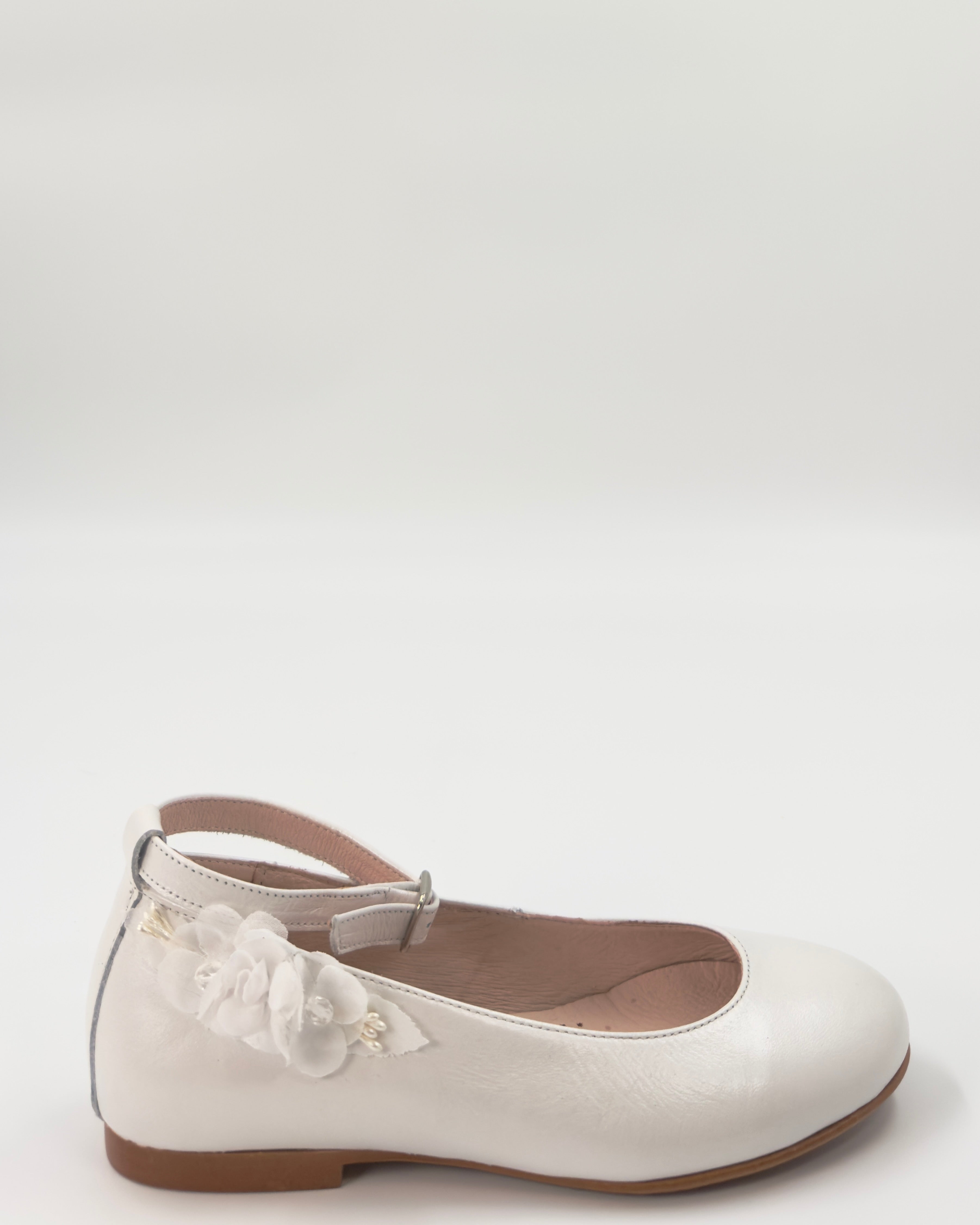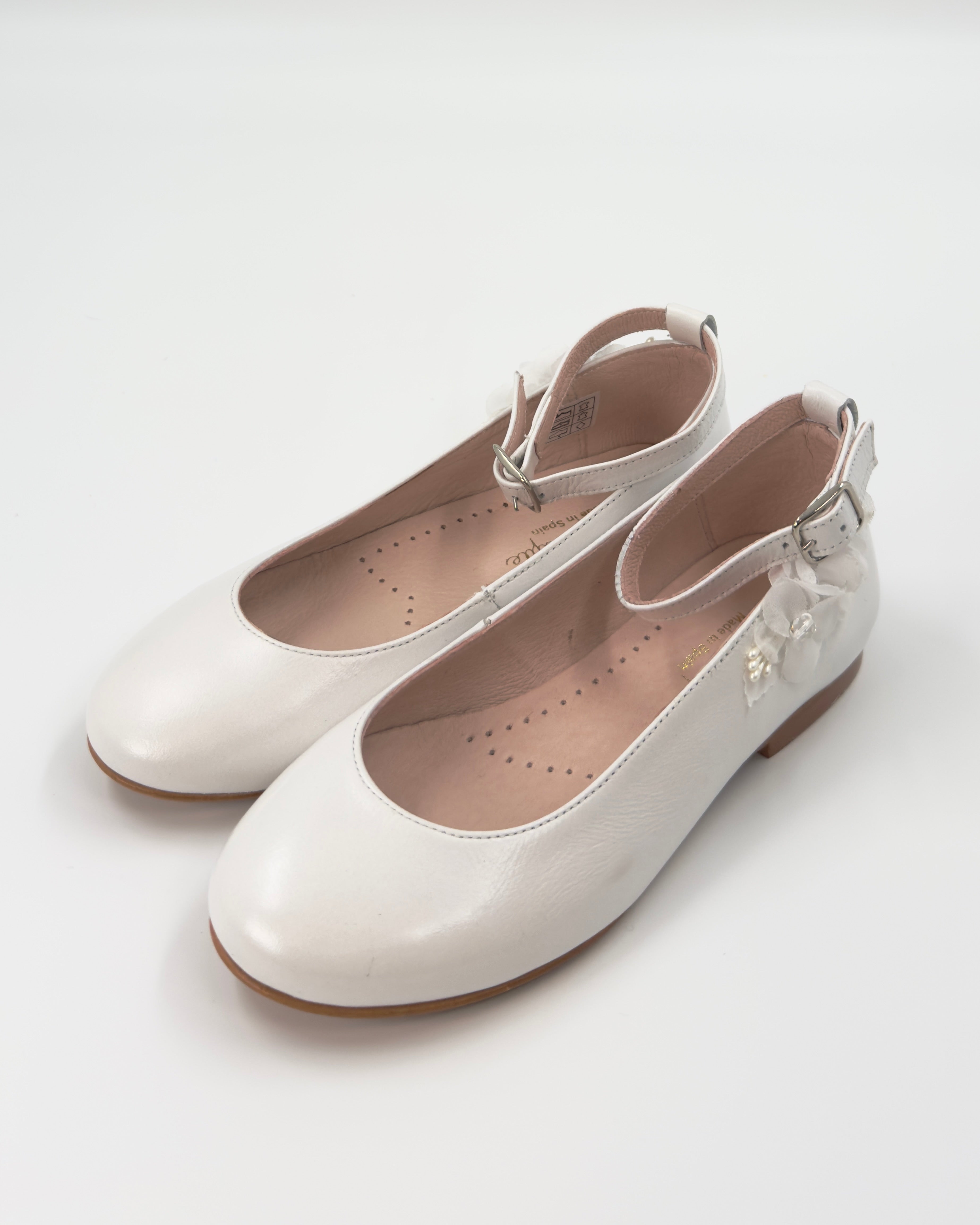 Our Off-White Ballerina Flat with Ankle Strap is a delicate and graceful choice for girls celebrating their First Communion or other special occasions. Made in Spain with attention to detail, this elegant flat features a secure ankle strap for added support and comfort. A beautiful floral appliqué on the side adds a soft, romantic touch—perfectly complementing formal dresses with timeless charm.